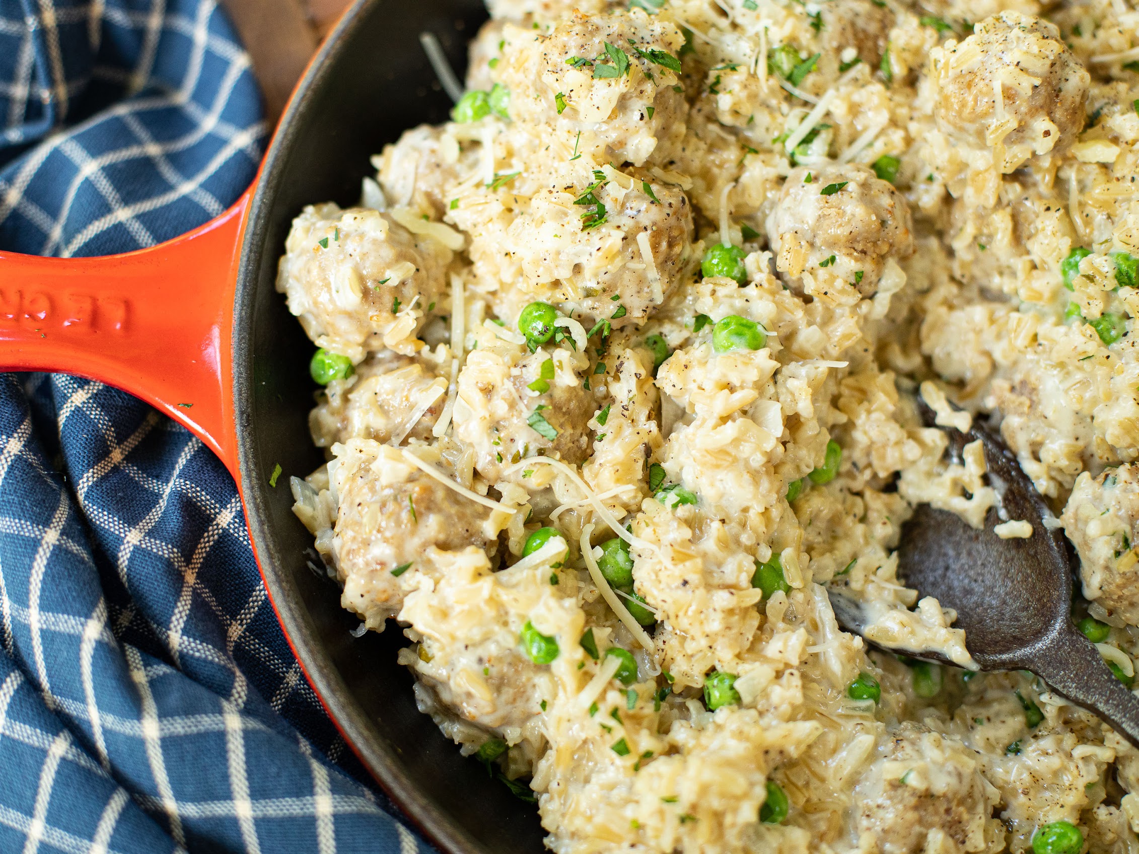 - Add the meatballs and then stir in chicken broth and Minute Instant Whole Grain Brown Rice.