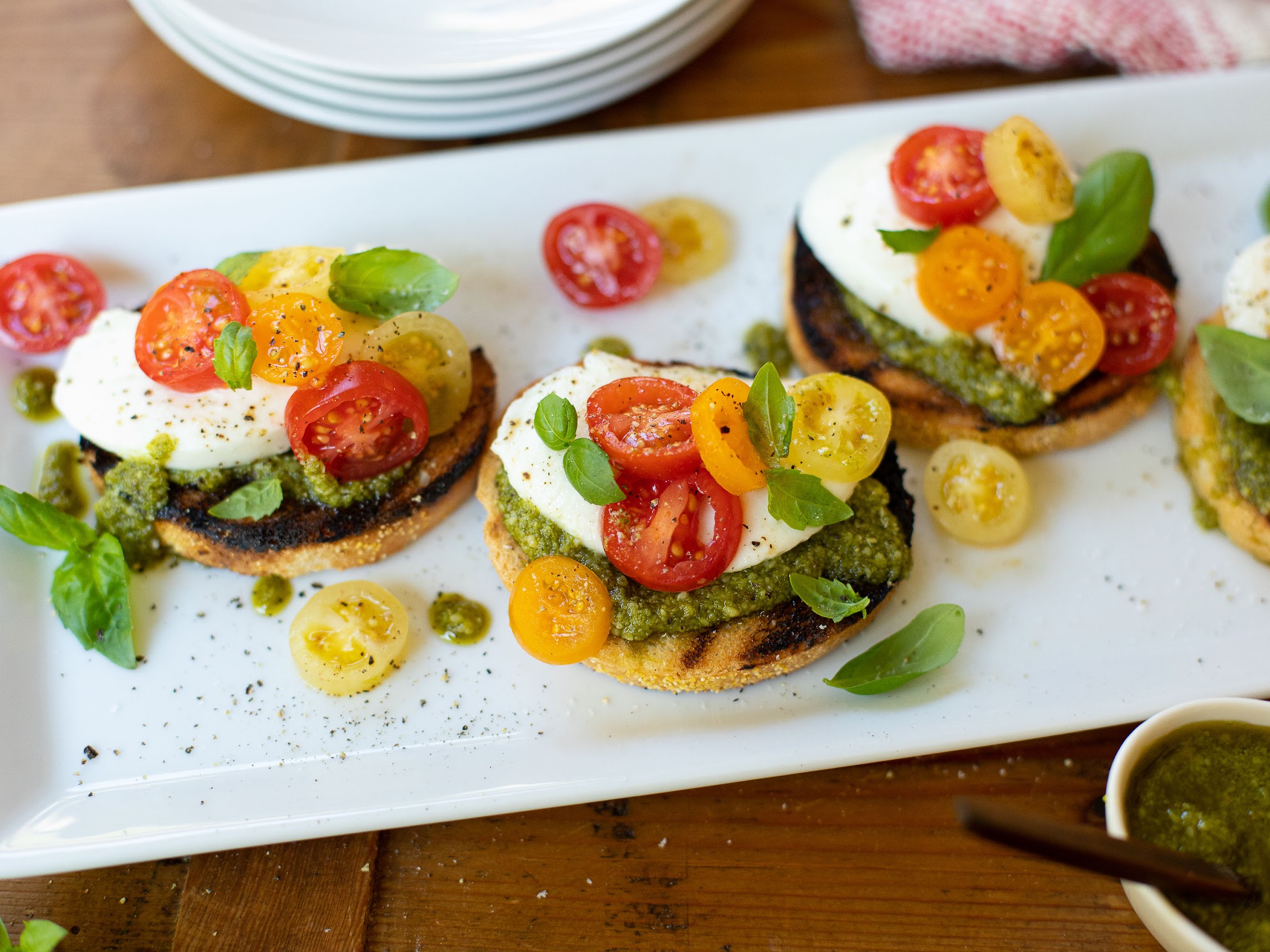 This Fresh Mozzarella Grilled Crostini recipe takes the ingredients found in a traditional Caprese salad (a personal favorite of mine) and puts them all on grilled, pesto-covered crostini slices of French or Italian bread. Once assembled, you just warm them all in the oven, top with fresh basil, and in a matter of minutes you’ve got a perfectly craveable appetizer to tempt your guests with. And between the rich, piney punch of the pesto and all the festive colors involved, it’s surprisingly seasonal!