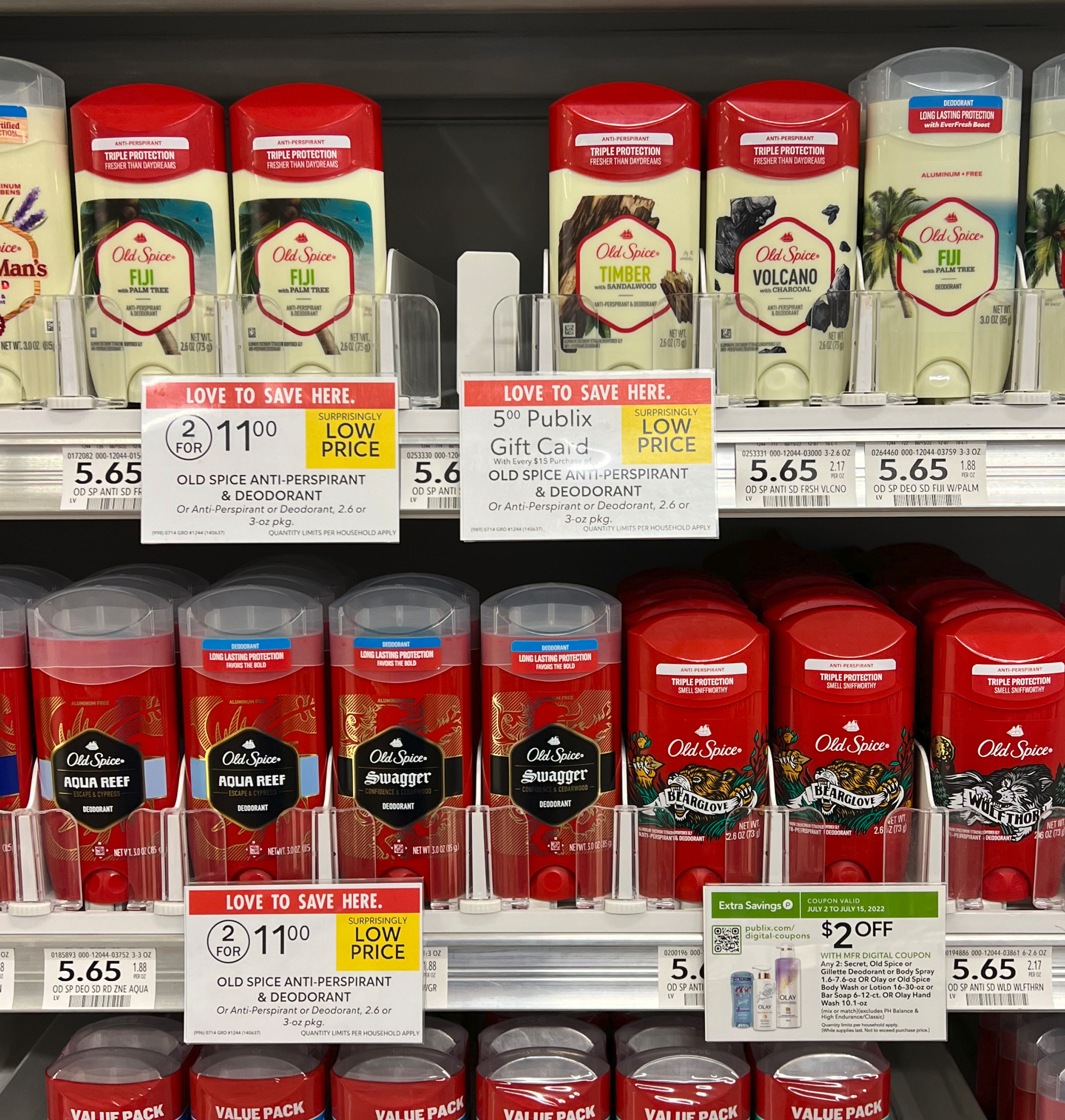 –$2/2 Secret, Old Spice or Gillette Deodorant or Sprays 1.6-7.6 oz., Olay or Old Spice Body Wash or Body Lotion 16-30 oz., Olay or Old Spice Bar Soap 6-12 ct. and/or Olay Hand Wash 10.1 oz. (excludes Secret PH Balance, Old Spice High Endurance/Classic) (Publix Digital Coupon) – EXP 7/15