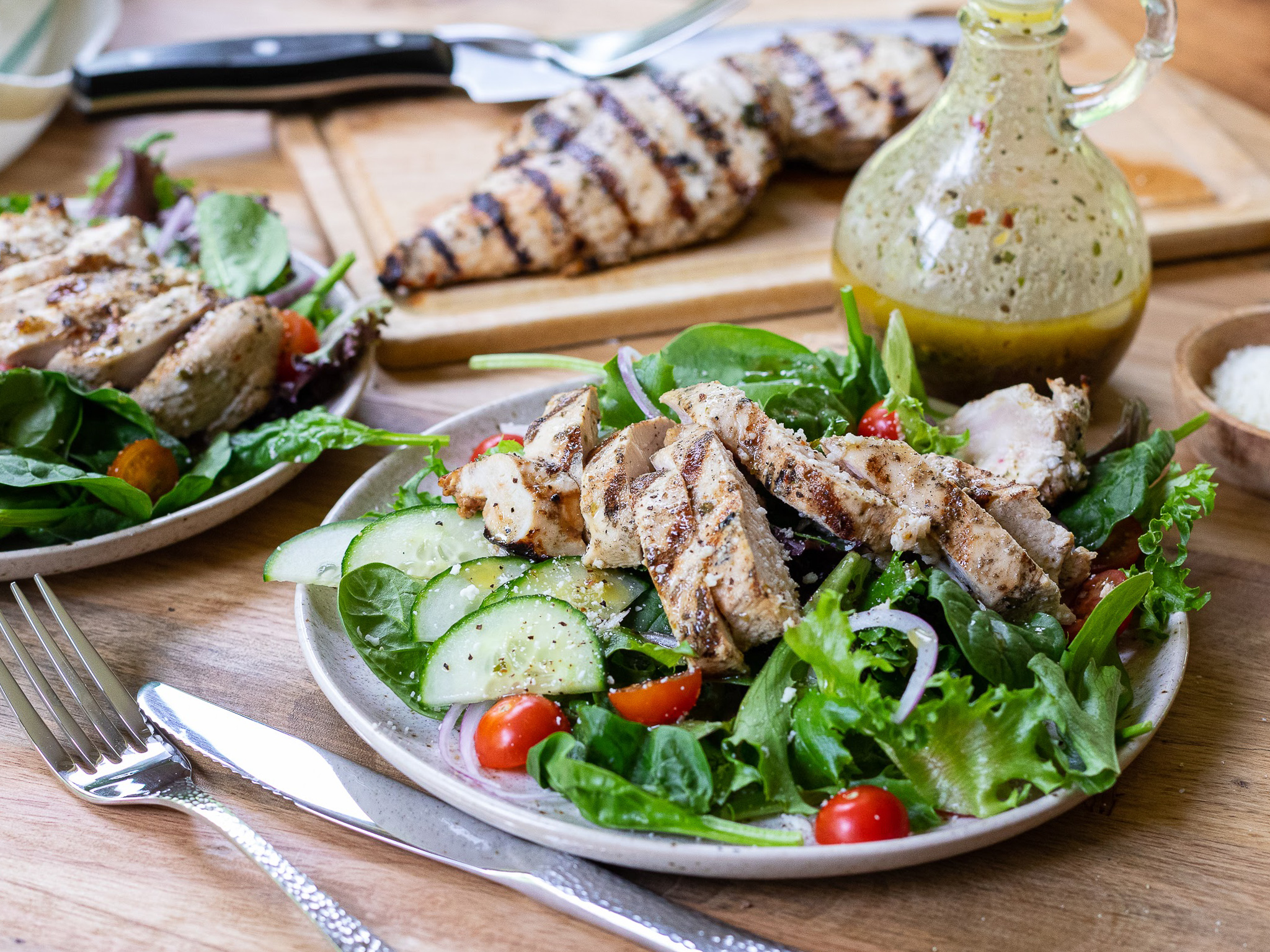 - Allow the chicken to rest for 3 - 5 minutes, slice and serve over salad or pasta drizzling with the reserved dressing, to taste.