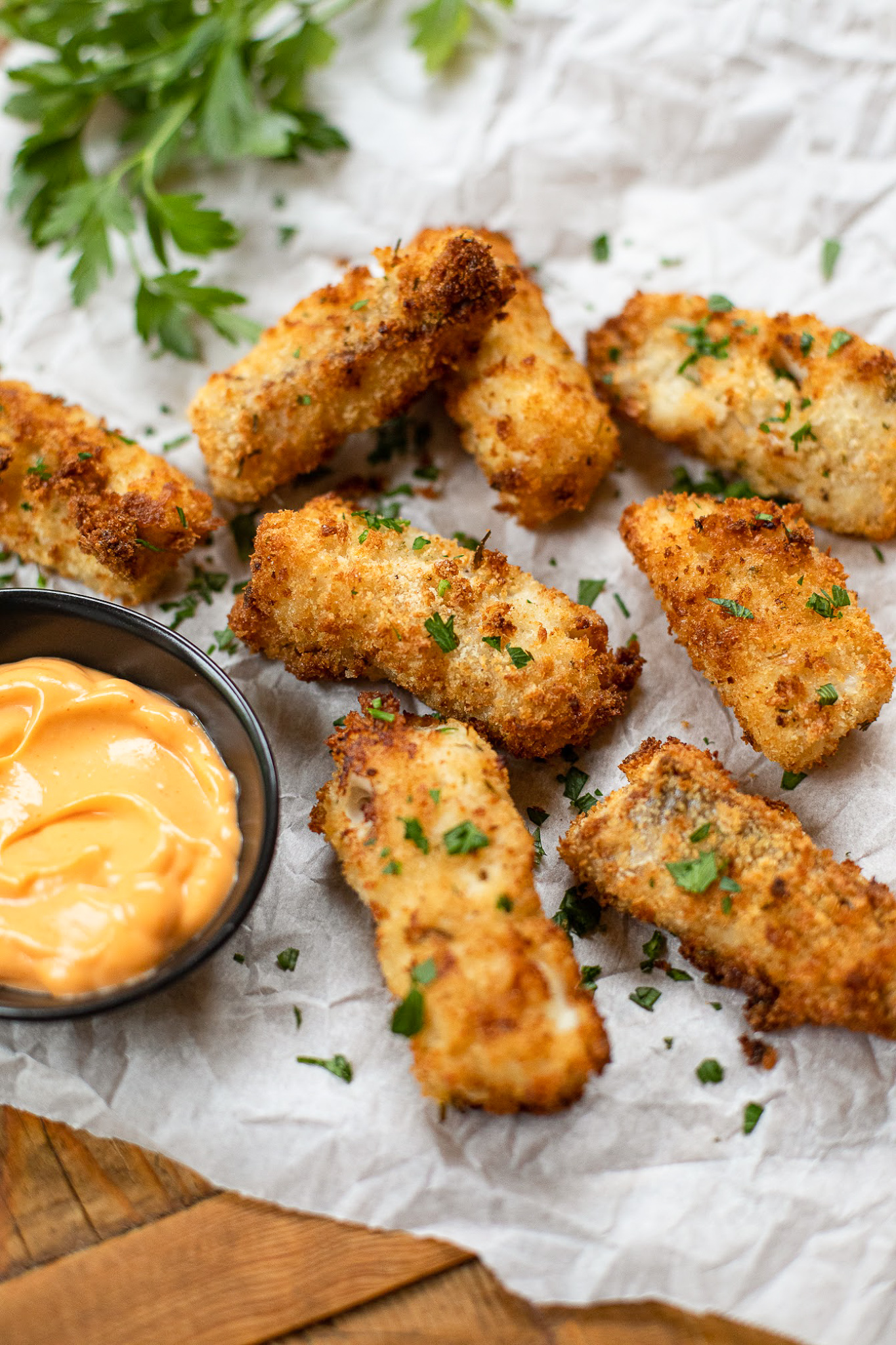 The key to my recipe is Hellmann’s Mayonnaise. The mayonnaise helps the breading stick and keeps the fish super moist. You end up with fish sticks that are crispy, flaky and so flavorful!