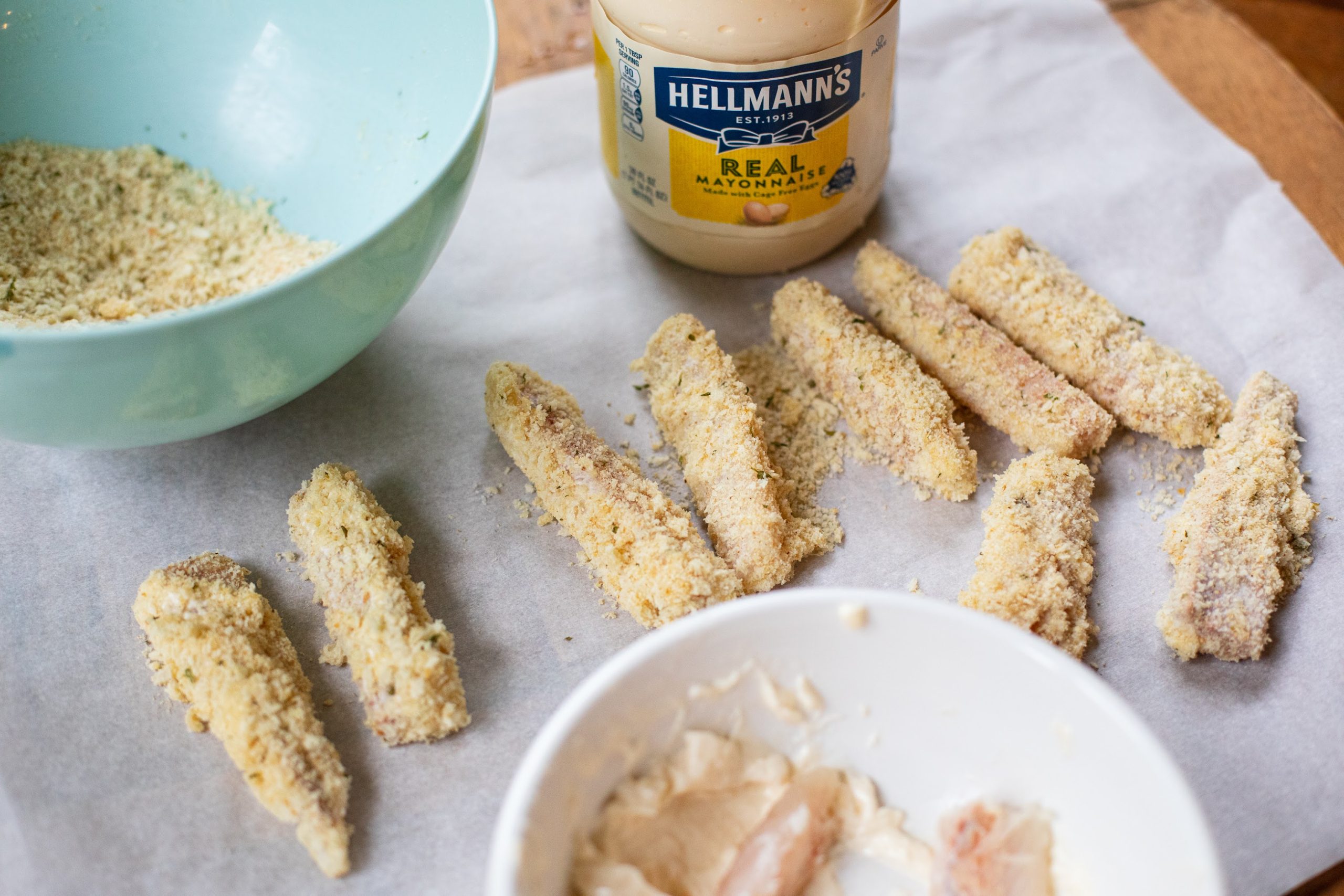 3. Dredge the fish strip into the mayonnaise and then dredge through the breadcrumb mixture, pressing to coat the fish entirely. Set aside on a parchment paper and repeat the process with all fish strips.