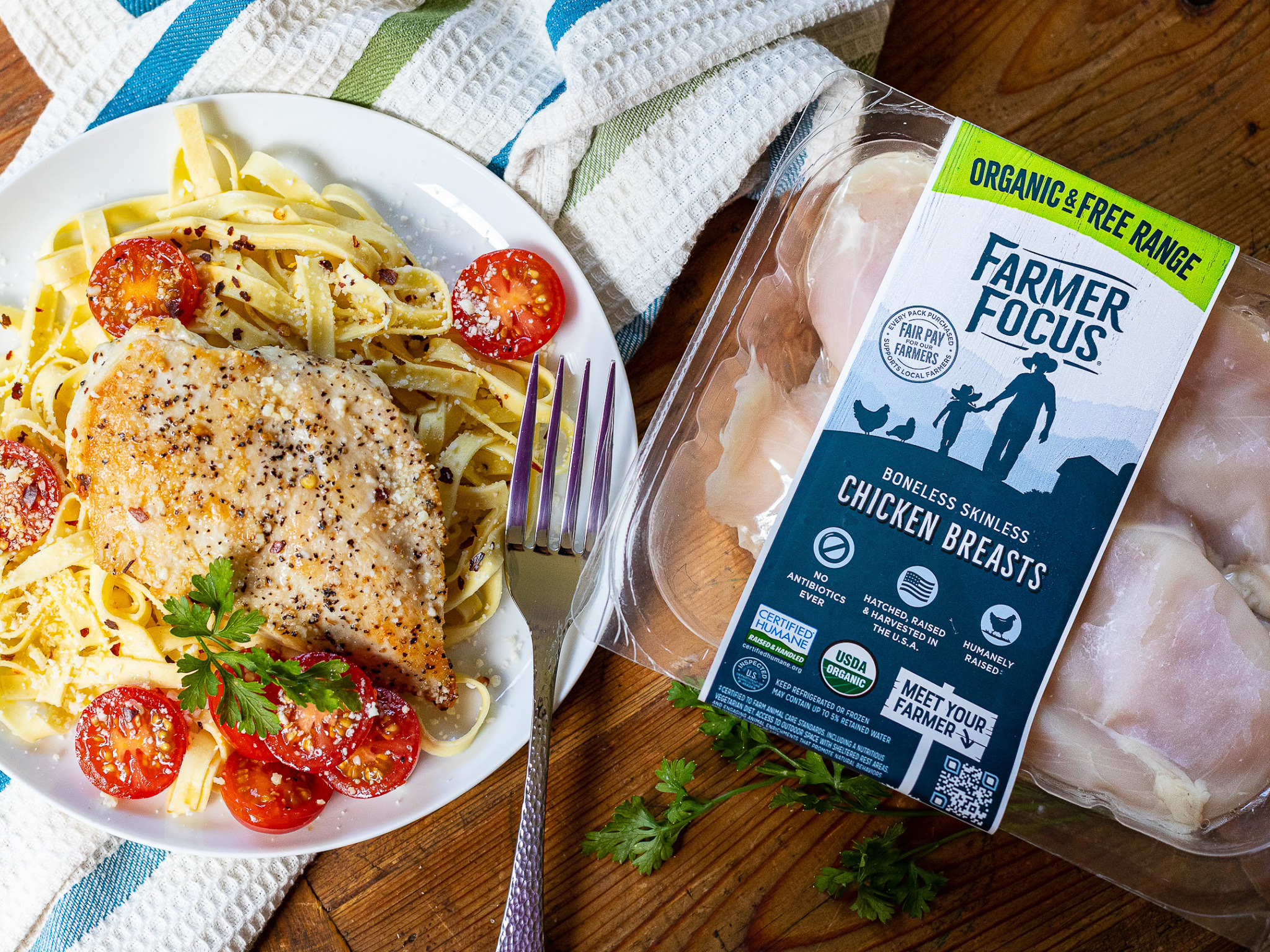 For starters, Farmer Focus is dedicated to raising superior flocks. Happier, healthier birds means better quality and taste. All of their birds are fed a 100% vegetarian and non-GMO diet, and each of their family farms has been certified non-GMO. It’s that commitment to going the extra mile that makes every bite of Farmer Focus chicken tender, juicy, and packed with flavor.
