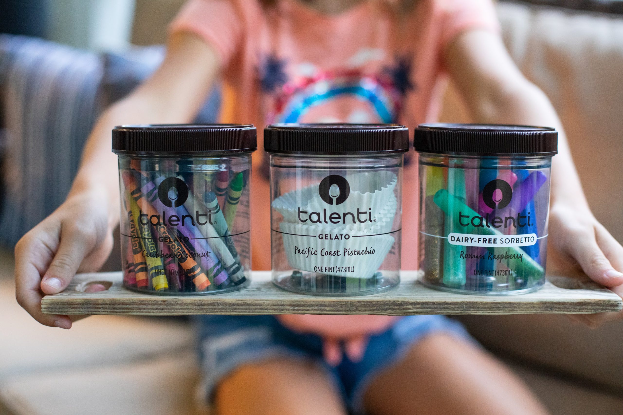 Need a fun gift for your younger kiddo? Grab a thin scrap piece of wood and attach a couple of Talenti tubs to the wood with some screws. You’ll have the perfect portable art station like you see above. It’s perfect for keeping supplies handy and great for on-the-go!