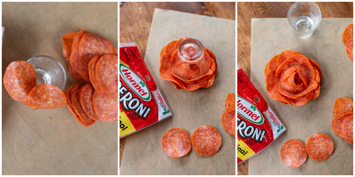 Just fold HORMEL® Pepperoni over a the lip of a small glass allowing them to overlap slightly. Repeat 4 – 5 times creating layers of pepperoni folded over top of each other. Flip the glass over to reveal a beautiful (and delicious) pepperoni rose!