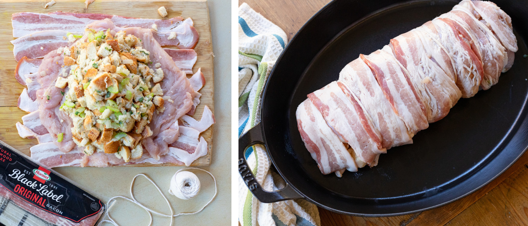 - Place the prepared turkey over the bacon and add the stuffing down the length of the breast then roll the breast to cover the stuffing, tucking the ends.