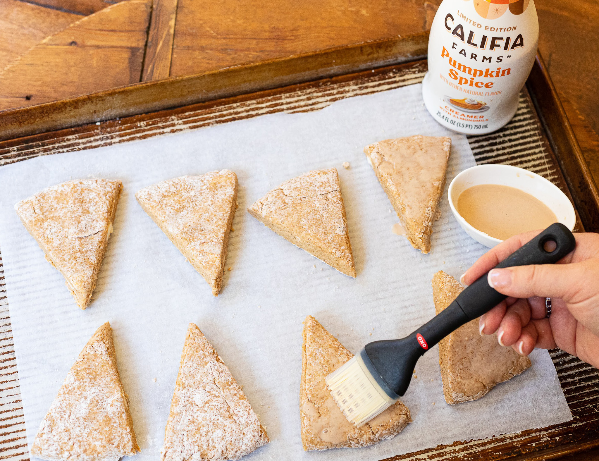 - Place on a parchment lined sheet pan and brush the tops of the scones lightly with creamer.