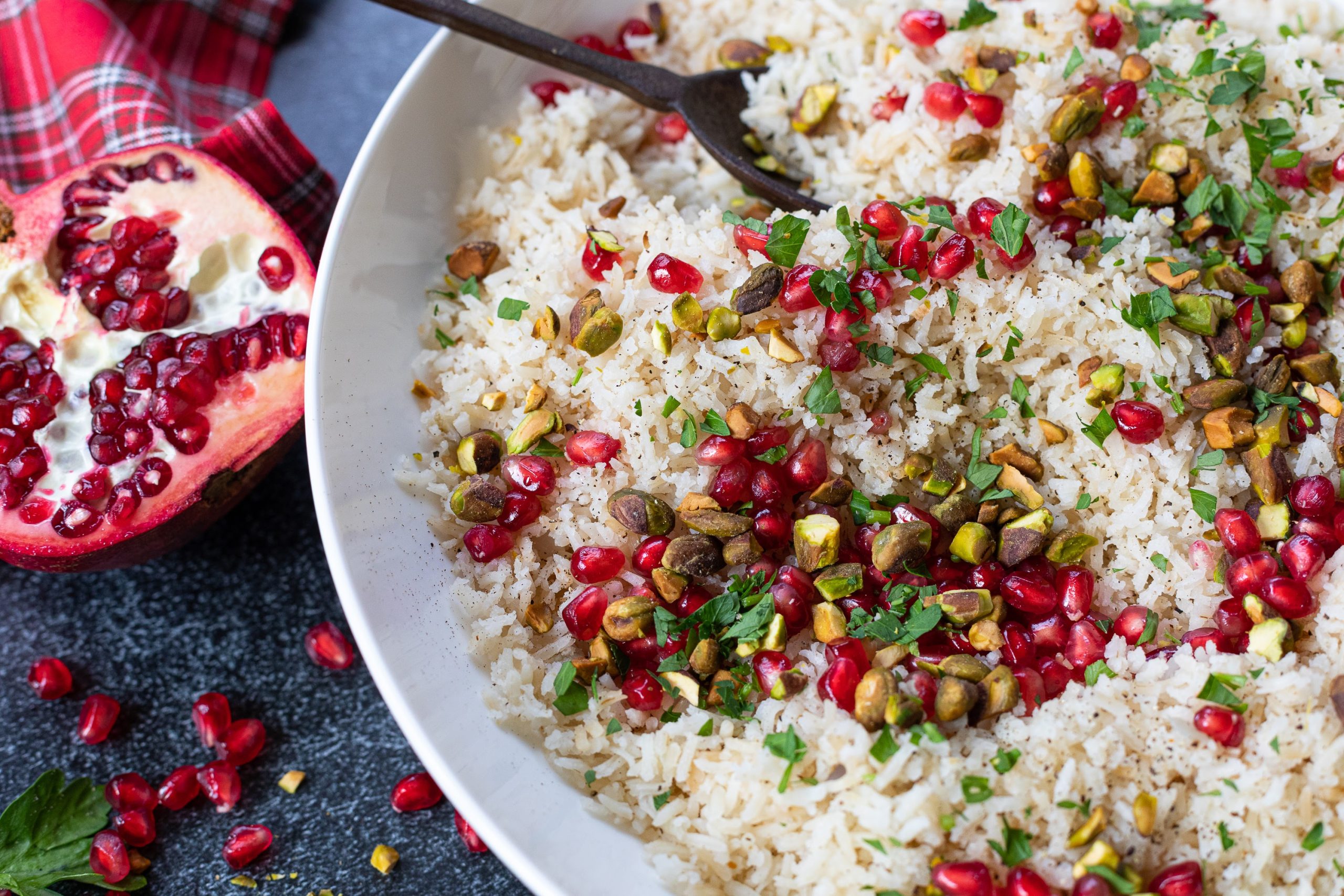 That Pomegranate Pistachio Rice Pilaf is better know as Christmas Pilaf here at my house. It’s the ultimate combination of sweet and savory and had the most amazing texture. It pairs perfectly with ham, roast beef, turkey or even a rib roast… pretty much any protein that you love. I know, because I have served it with a variety of proteins over the years.