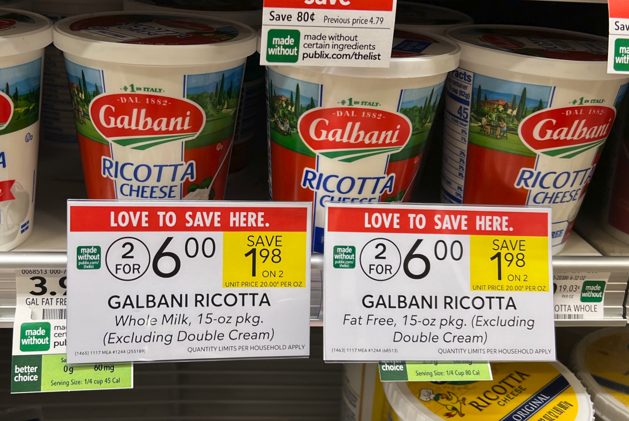 Head to Publix and pick up a tub of Galbani Ricotta Cheese for just $2 after sale and coupon. Whip up some lasagna or stuffed shells at a super price.