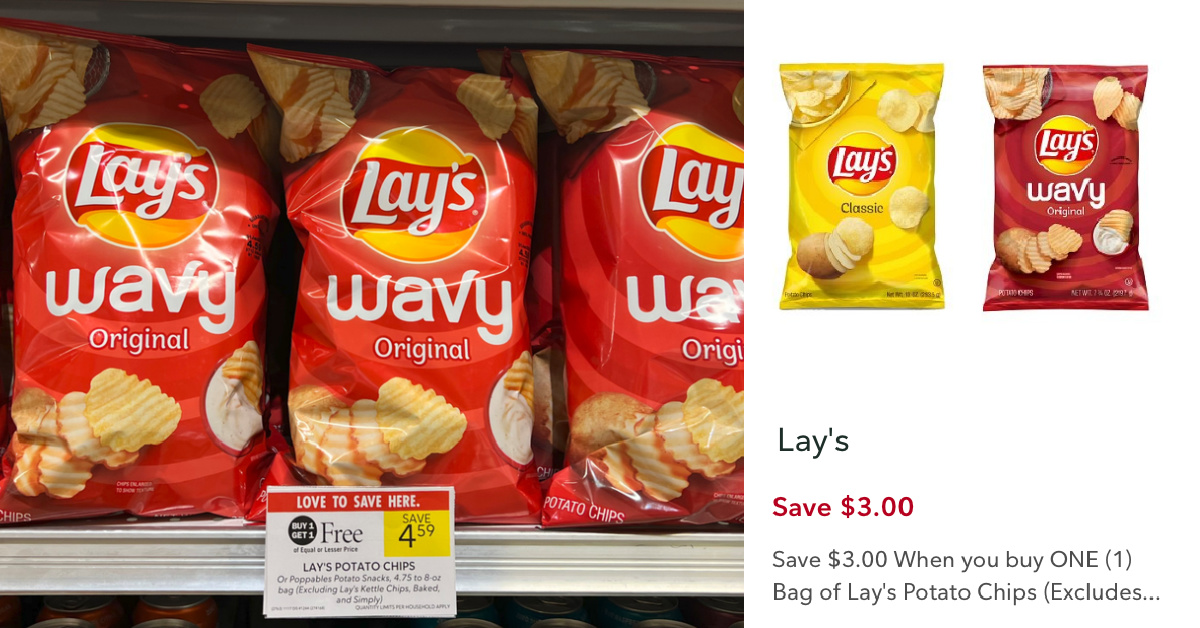 –$3/1 Bag of Lay’s Potato Chips (Excludes Party size, Baked, and Single serve bags) Publix Digital Coupon