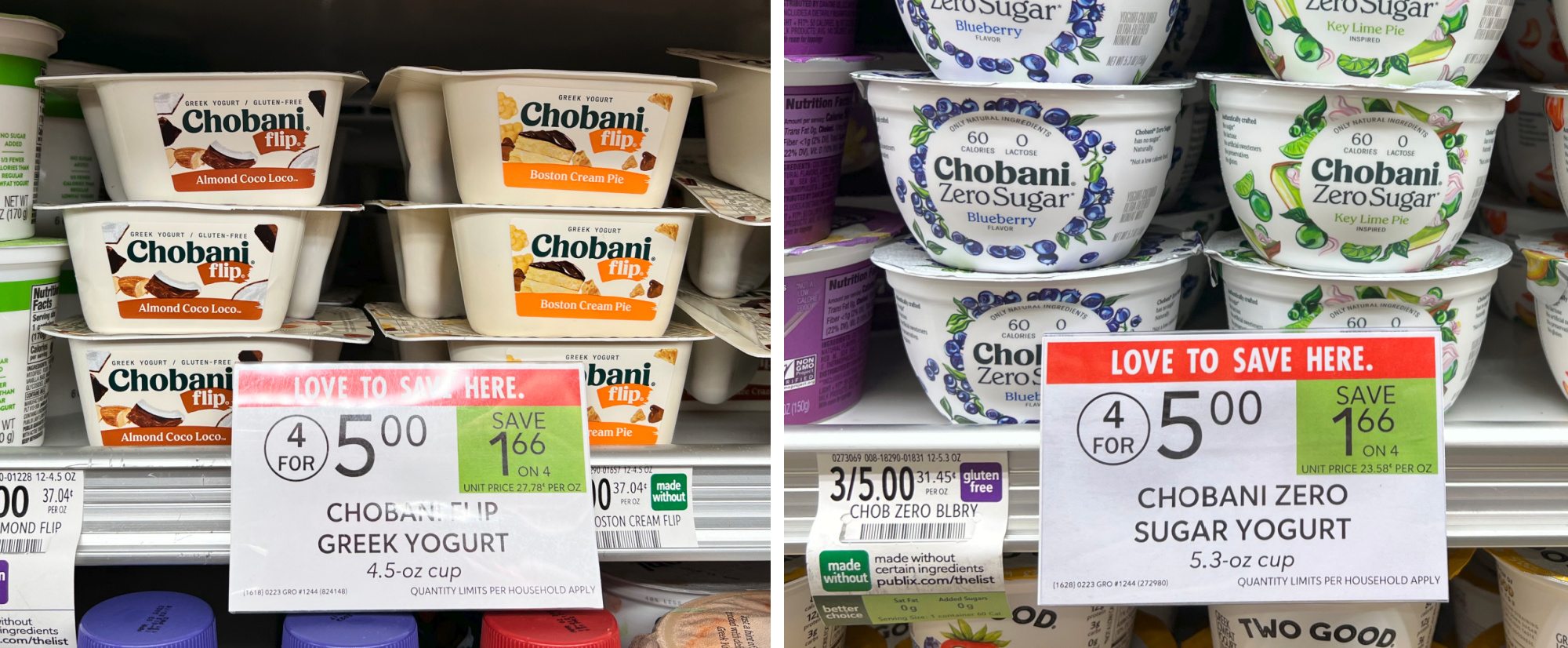 Chobani Flip Greek Yogurt, 4.5 oz, or Zero Sugar Yogurt, 5.3 oz, 4/$5