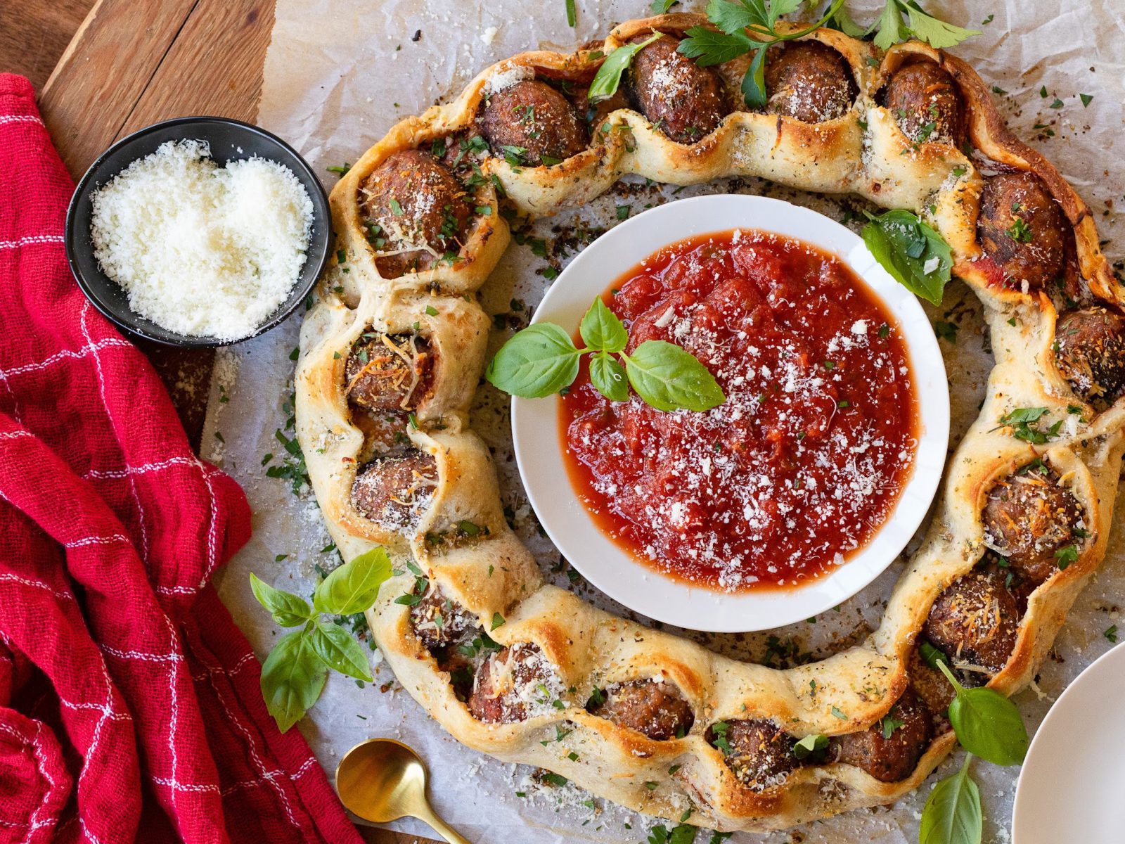 - Sprinkle the cheese down the middle of the dough and add the meatball halves over the cheese, spacing evenly. Spoon the sauce over the meatballs.