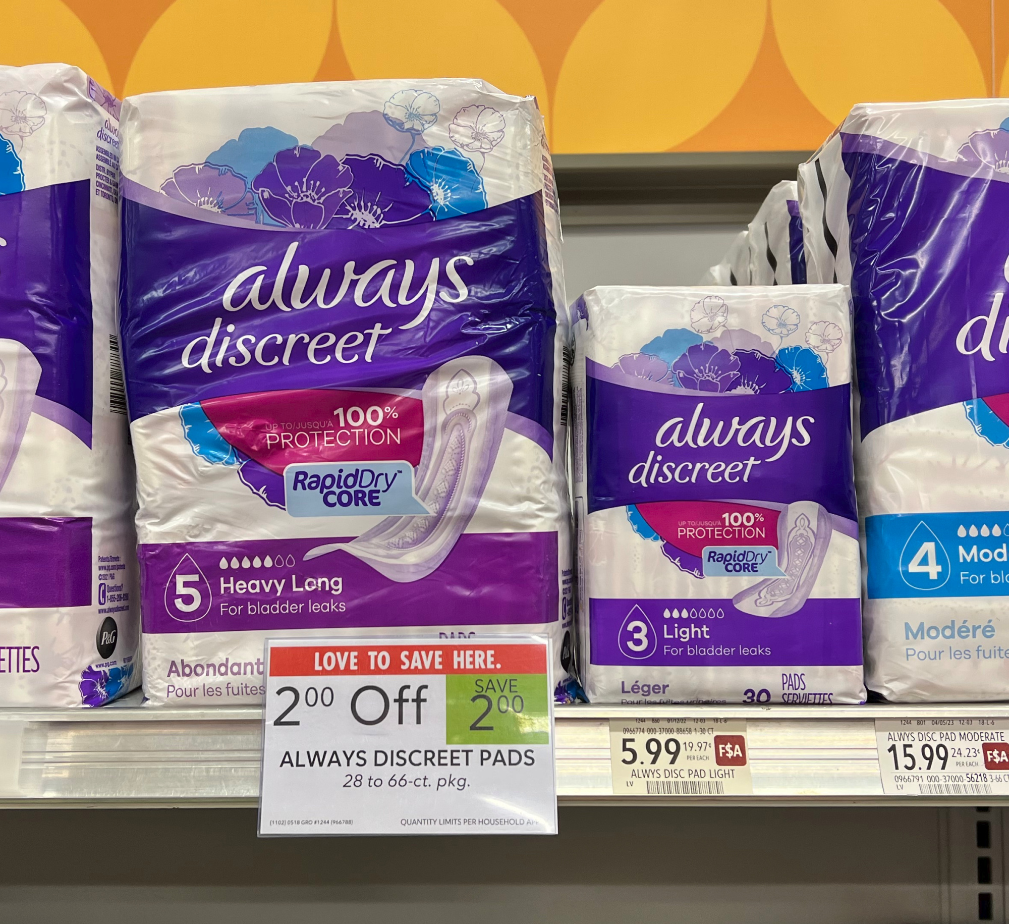 -$2/1 Always Discreet Incontinence Product (excludes 24ct & 26ct always discreet Liners, other Always products, and trial/travel size), 4/30 SAVE, exp. 05/27/2023