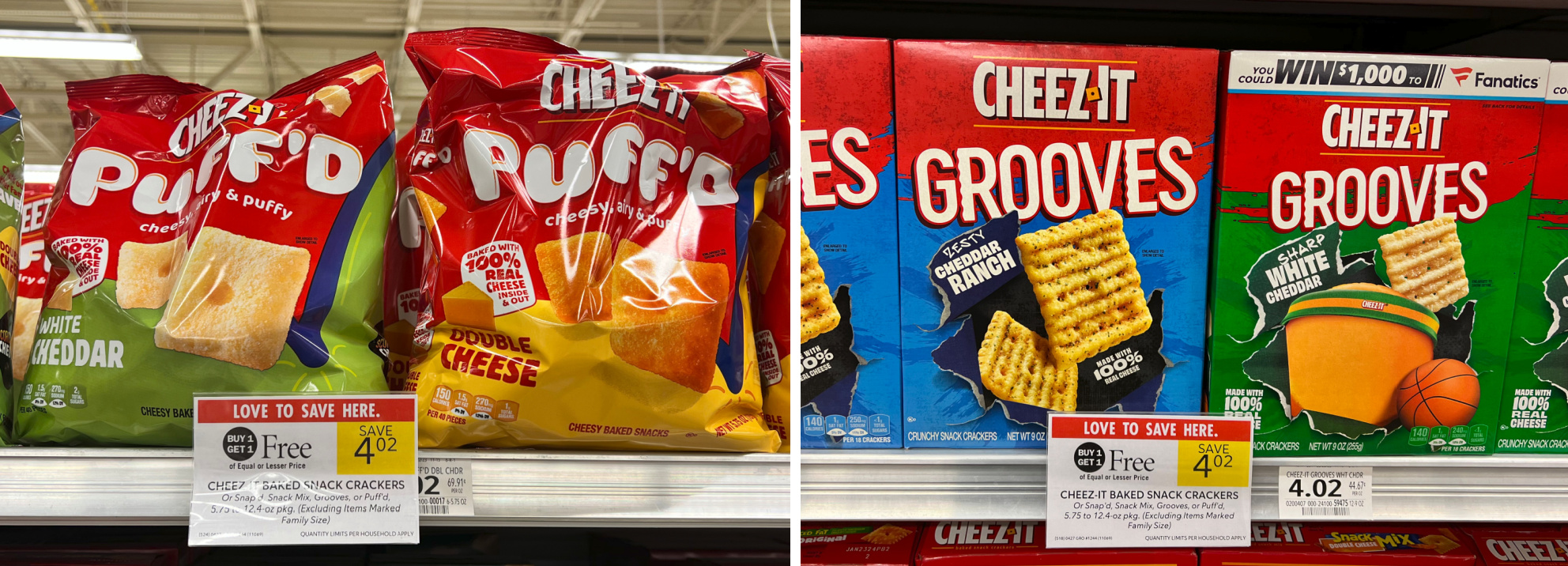 Cheez-It Baked Snack Crackers, or Snap’d, Snack Mix, Grooves, or Puff’d, 5.75 to 12.4 oz, (excluding Items Marked Family Size), BOGO $4.02