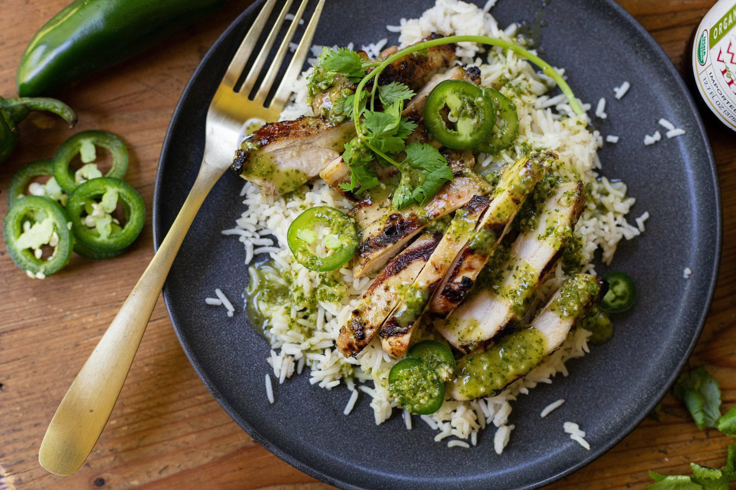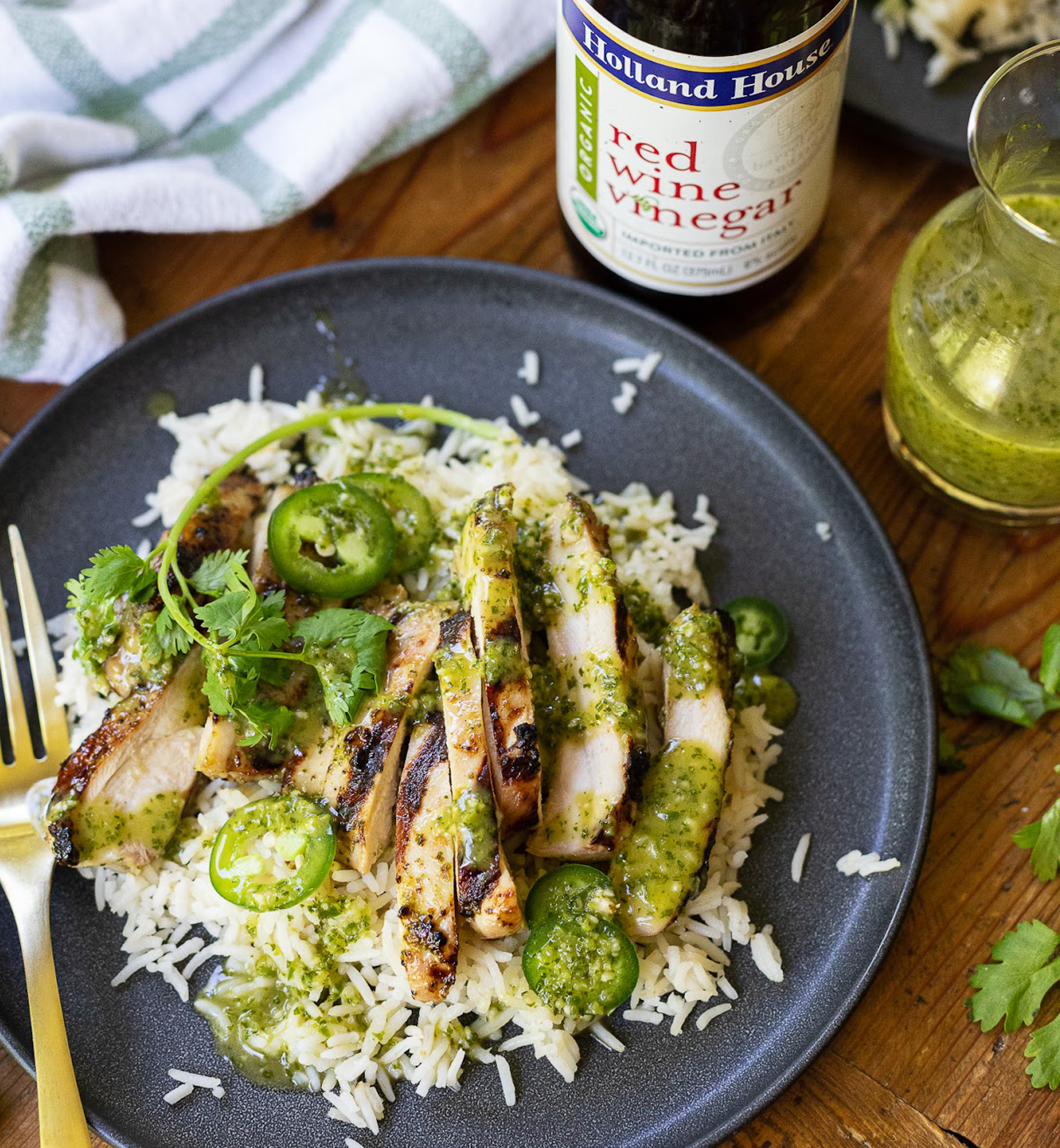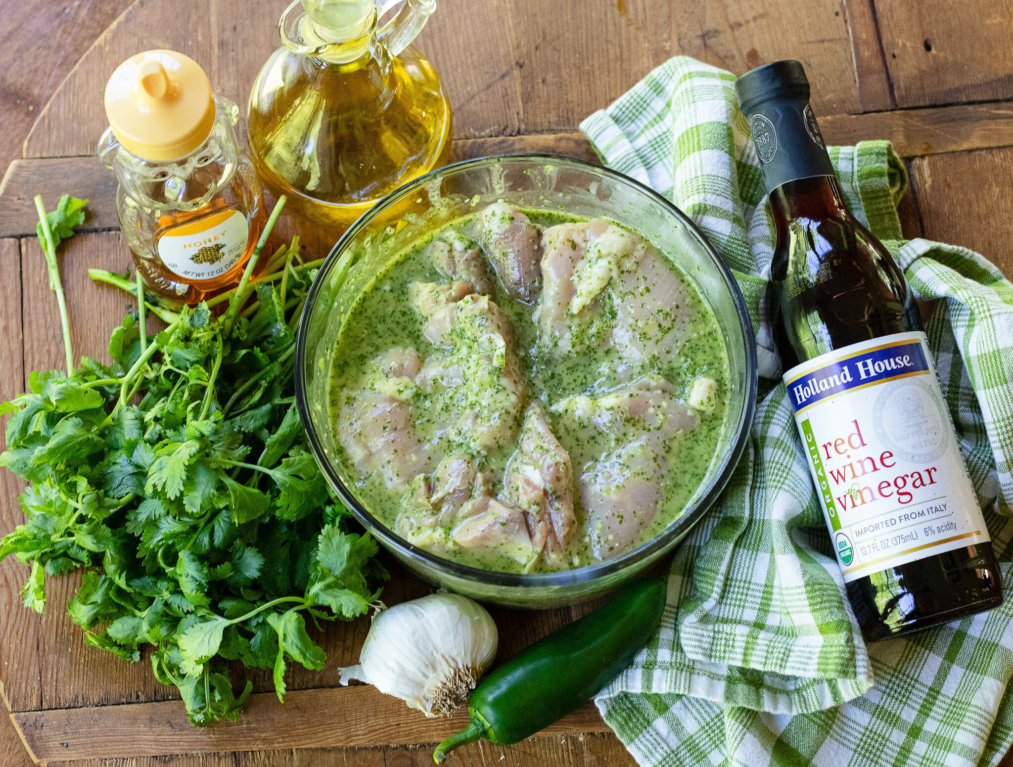 To get started, all you have to do is pull out your blender or food processor and throw in some Holland House® Organic Wine Vinegar, cilantro, garlic, honey, olive oil and a little fresh jalapeño. All those items come together for the most amazing marinade and dressing.