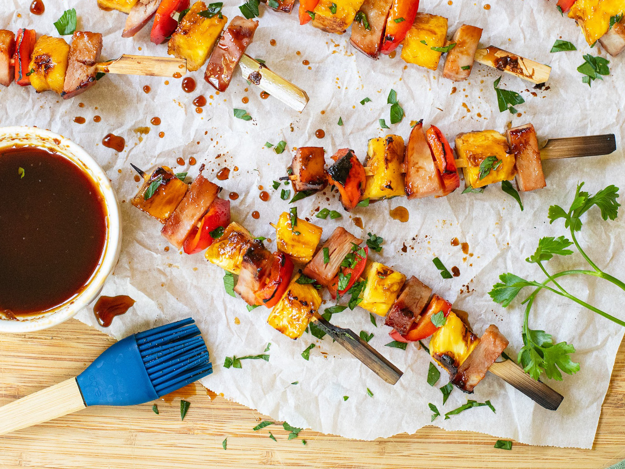 Take my Grilled Hawaiian Ham Steak Skewers for example. This amazing recipe requires just four ingredients and is ready in under 30 minutes from start to finish. You simply thread fresh pineapple, bell pepper and delicious Greenfield Natural* Meat Co.™ Ham on a skewer. From there you grill the skewers and baste with some teriyaki sauce for the perfect summer meal in a flash.