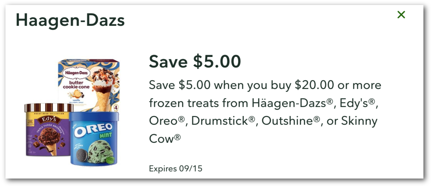–$5 Off wyb $20 or more on frozen treats from Häagen-Dazs, Edy’s, Oreo, Drumstick, Outshine, or Skinny Cow (Publix Digital Coupon)*