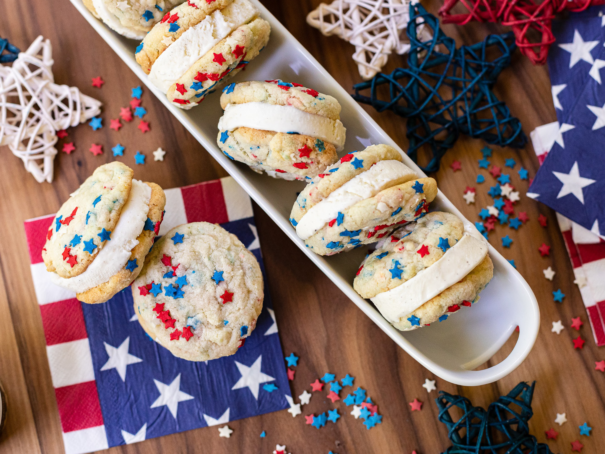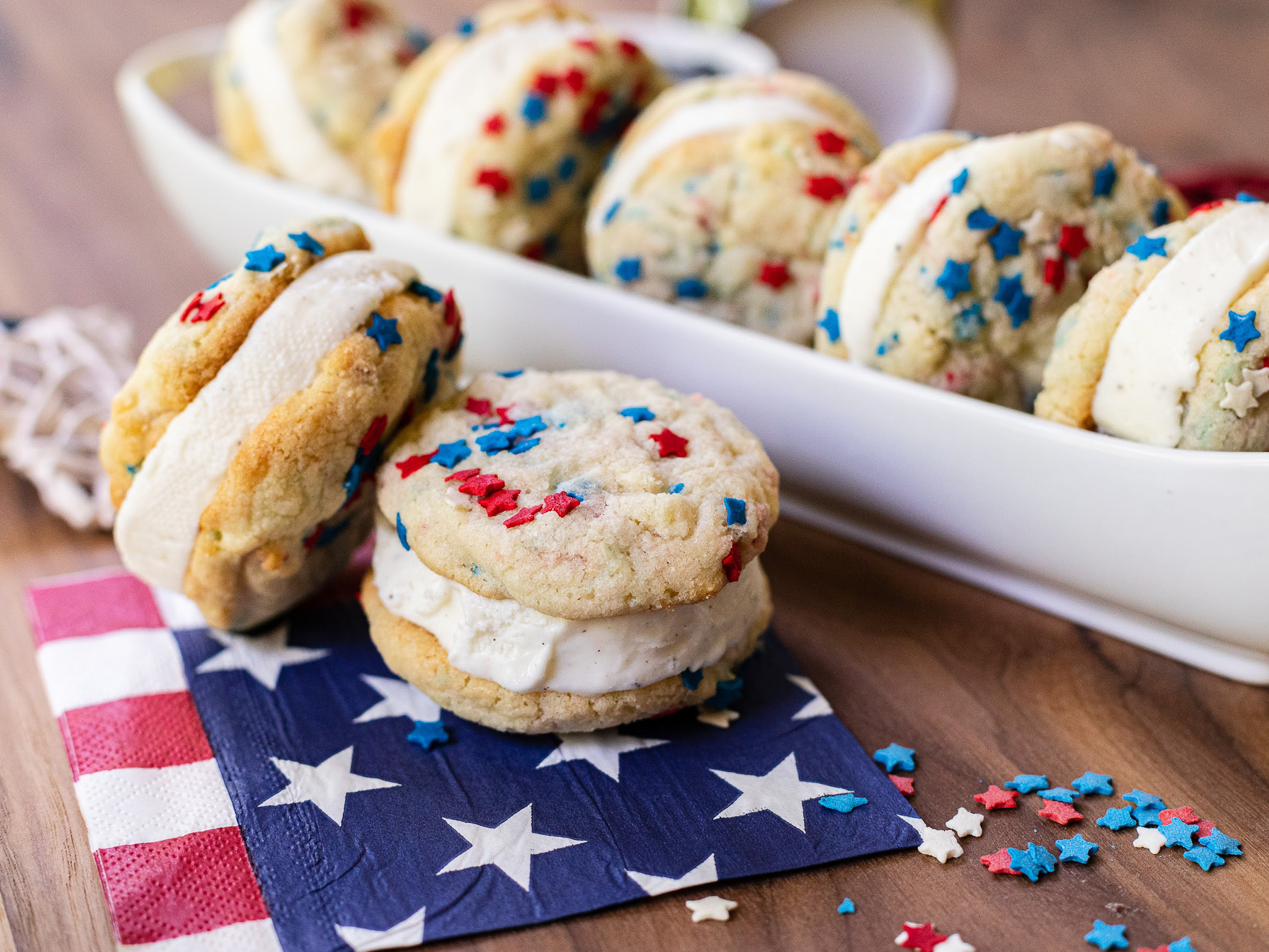 What I like most about these frozen treats, besides the great taste, is that you can customize them as you’d like. A few sprinkles or colored sugar is all it take to go from basic to festive. For the 4th of July, I use red, white and blue sprinkles. To serve these at Christmas, I go with red and green sanding sugar. Then for Valentine’s Day, I simply mix in pink hearts and voila… a cookie for any occasion!