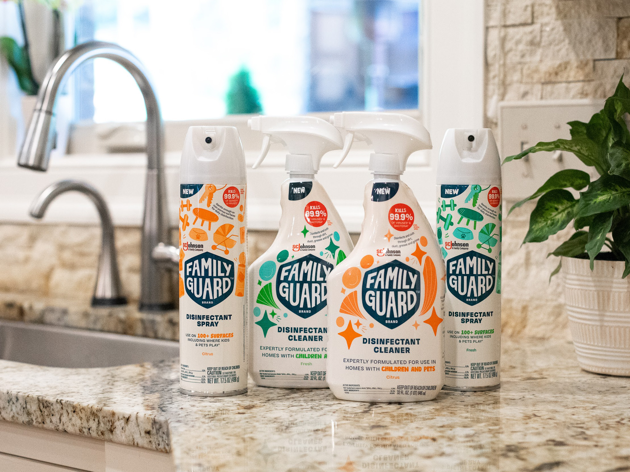 FamilyGuard™ Brand Disinfectant Cleaner kills 99.9% of viruses & bacteria on hard, non-porous surfaces*.