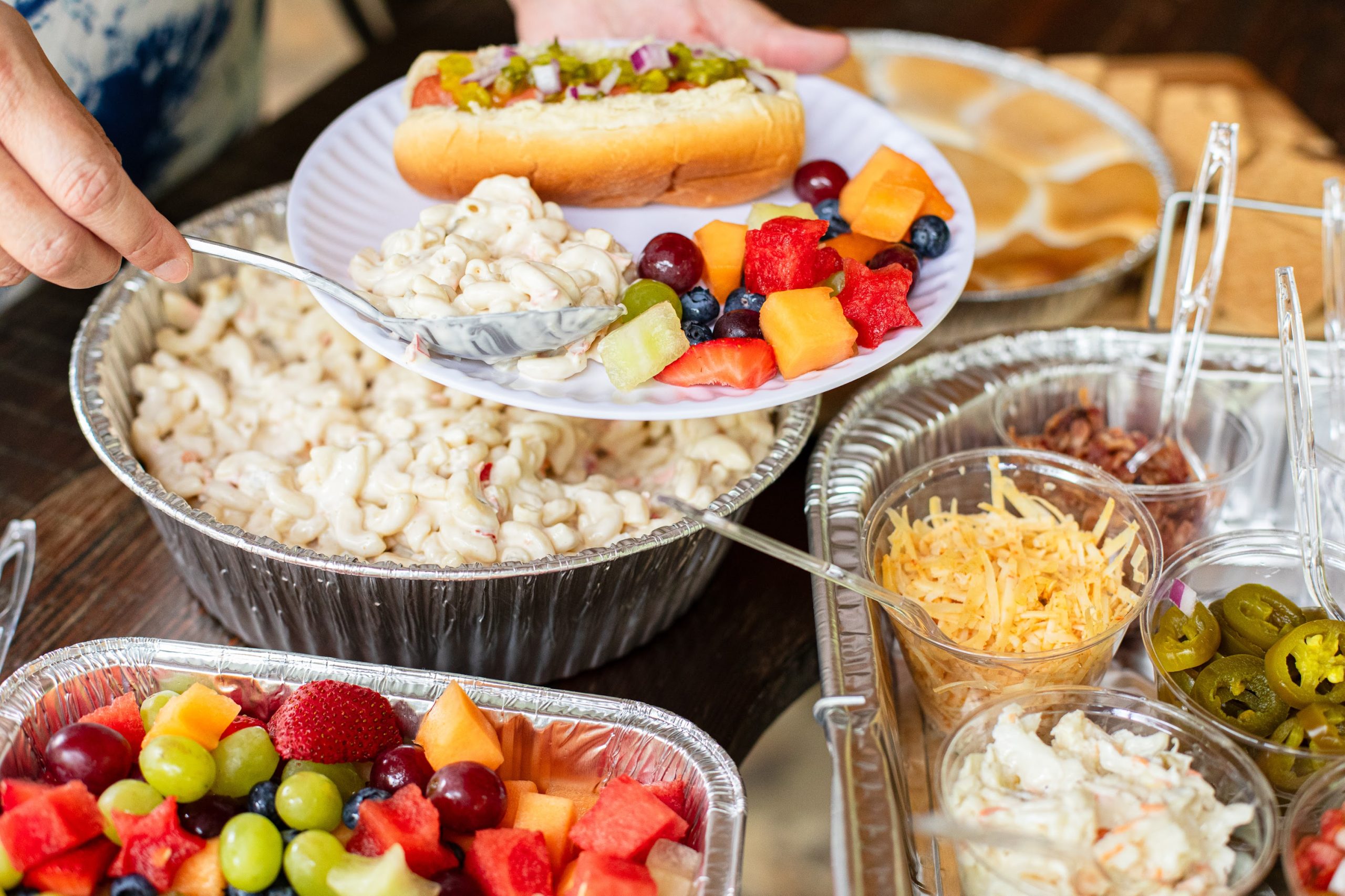 I use those handy pans anytime I can. So for my hot dog bar, I just fill a bunch of plastic cups with toppings and pop them all in an EZ Foil® Roaster Pan. It’s the easy way to keep all the toppings organized and with handles, I can transport everything all at once from my kitchen out to the food table.