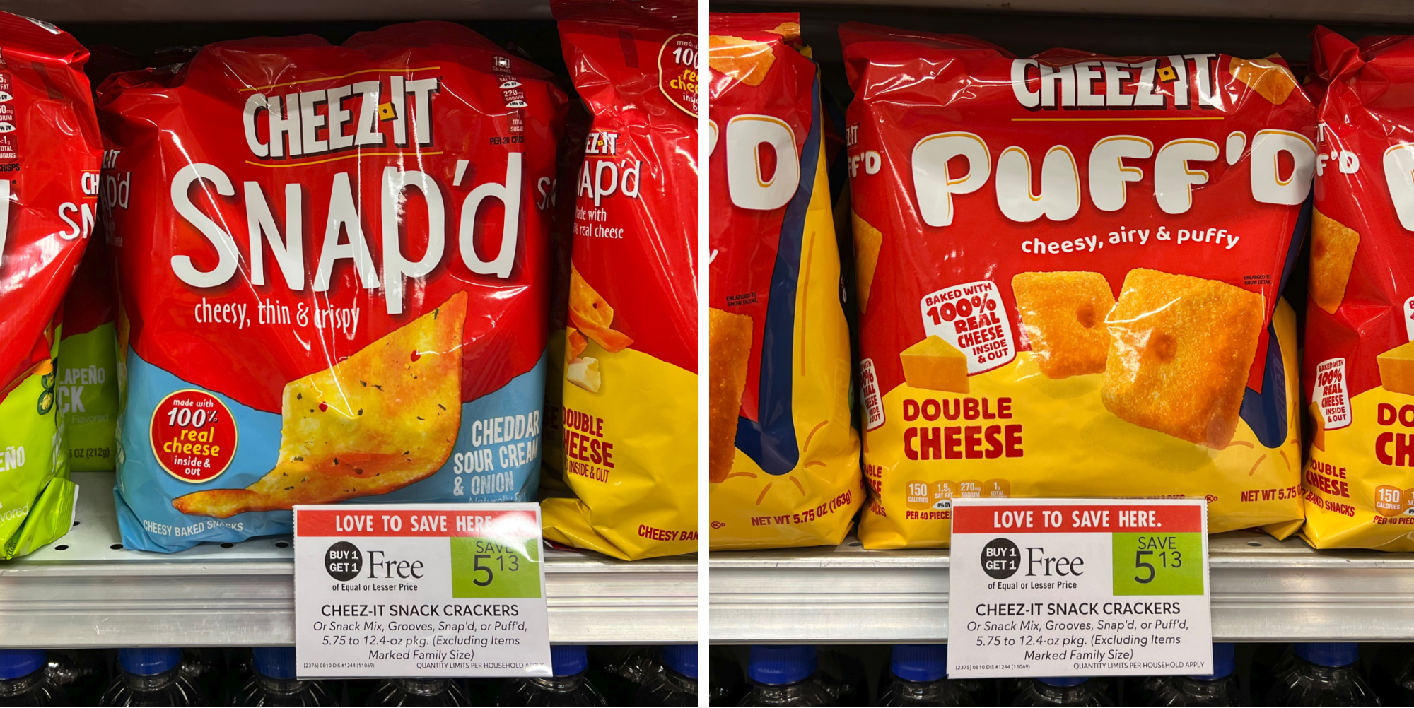 Cheez-It Snack Crackers, or Snack Mix, Grooves, Snap’d, or Puff’d, 5.75 to 12.4 oz, (Excluding Items Marked “Family Size”), BOGO $5.13