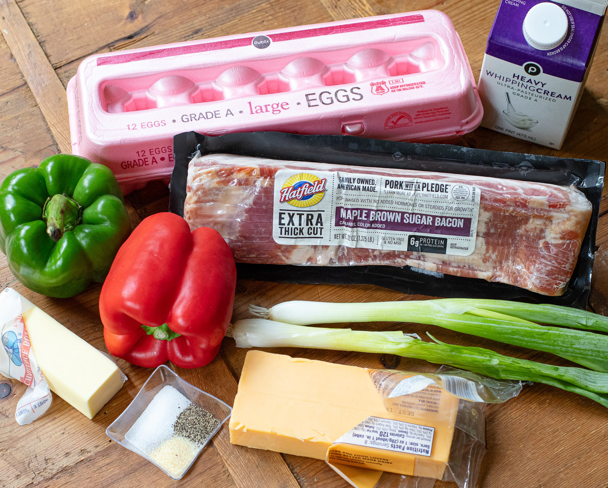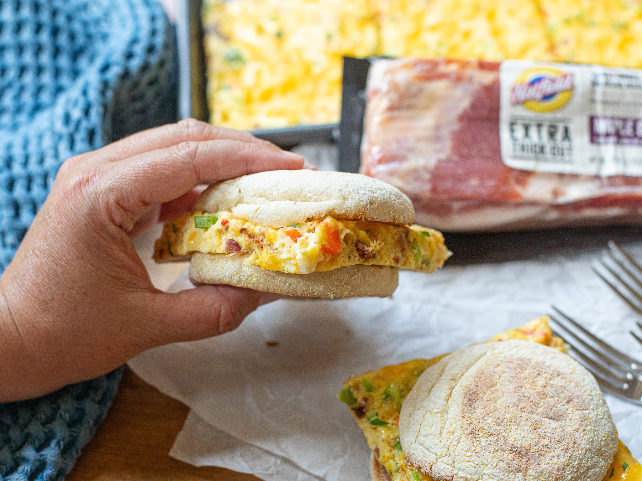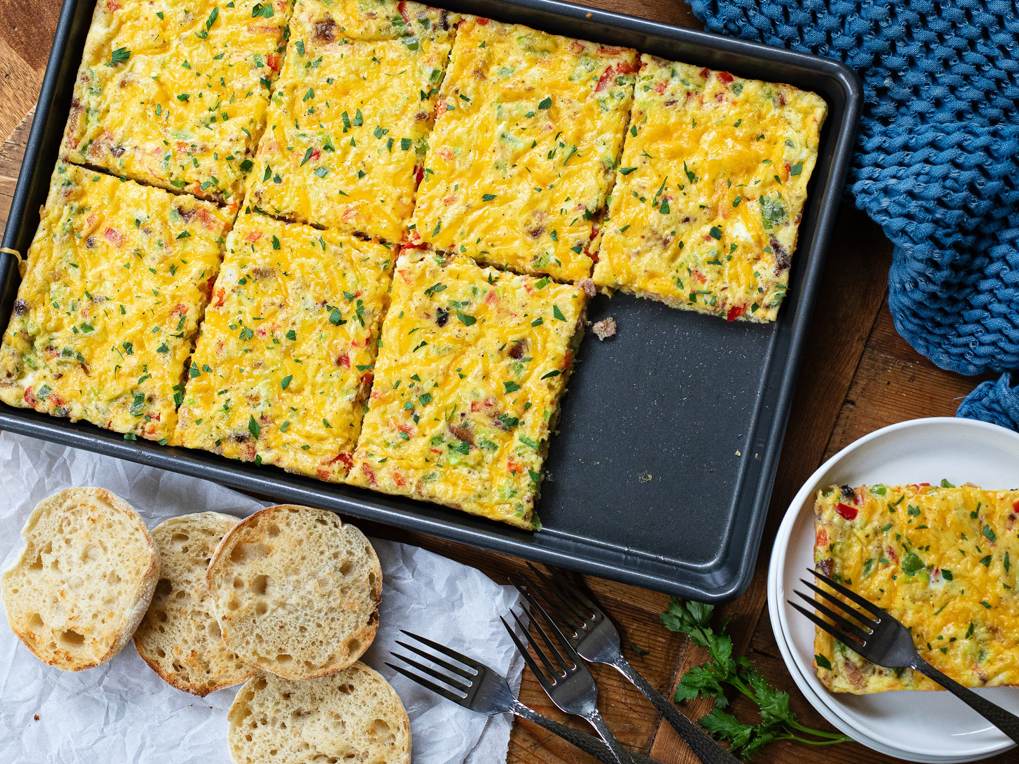 If a sheet pan omelet is not on your menu, you are really missing out. Easy and delicious, this is the perfect prep-ahead meal or meal when you need to feed a crowd. And with the BOGO sale on Hatfield Bacon, you can serve up great taste and save lots of moolah!
