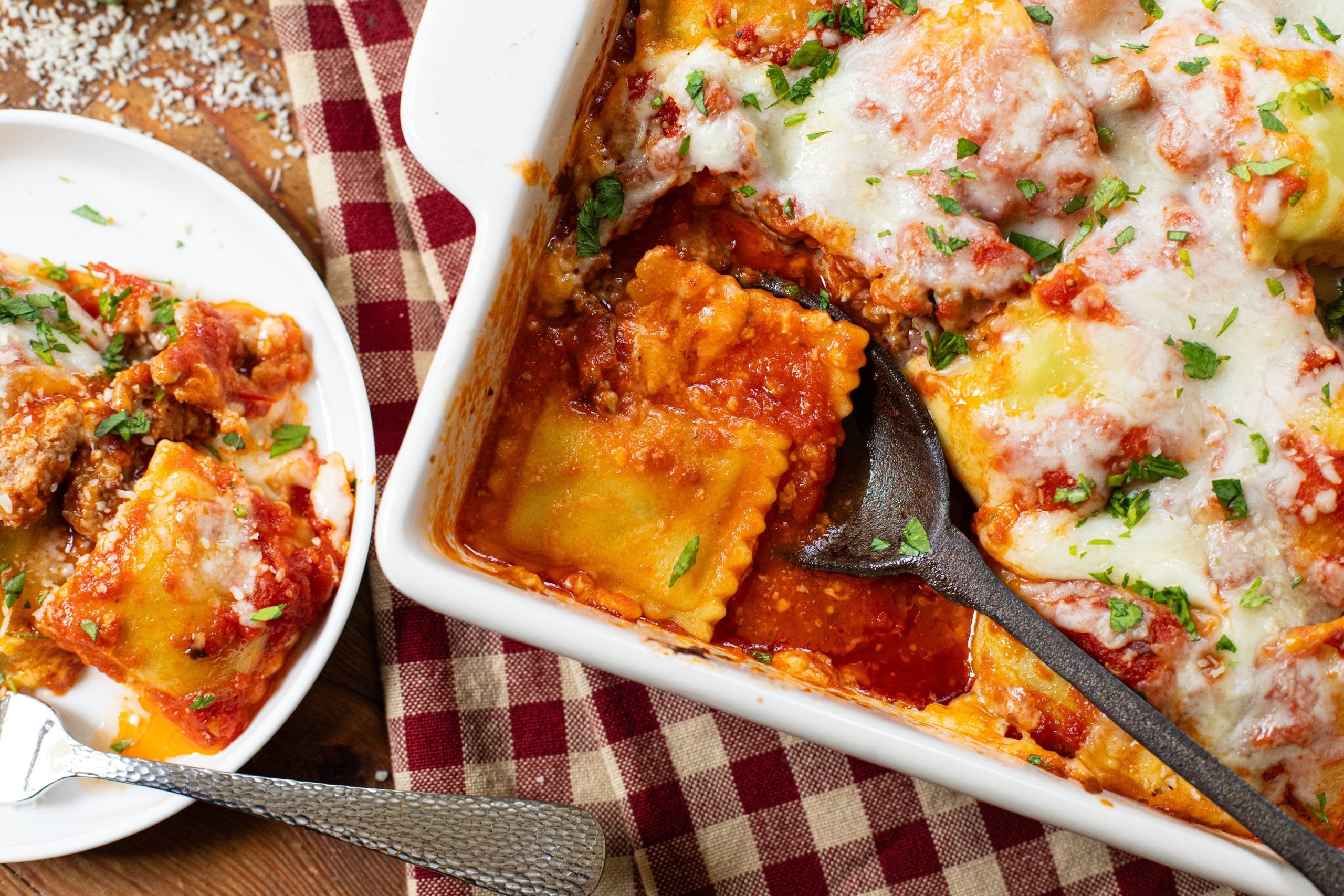 - Spread 1 cup of the sauce on the bottom of the prepared baking dish, followed by 1/2 of the cooked sausage, half of the ravioli and 1/3 of the cheese. Repeat the layer again and then top with the remaining sauce and mozzarella cheese.