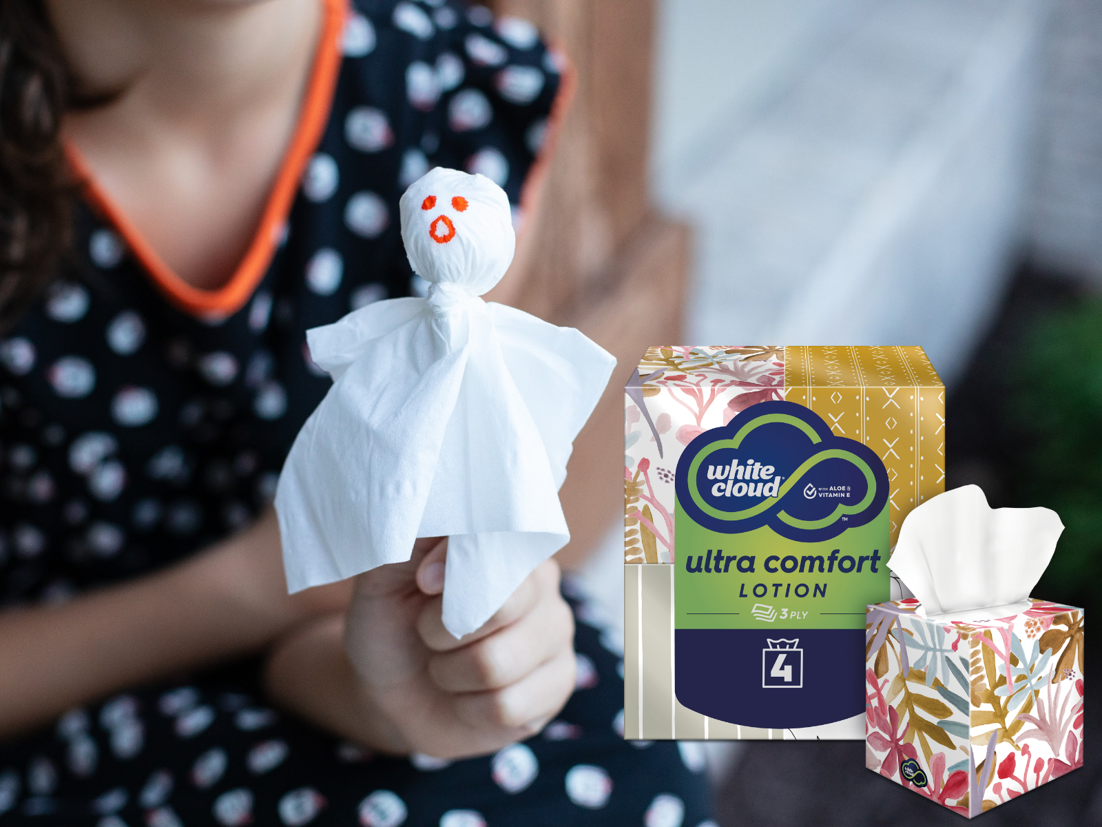 Start with NEW White Cloud® 3 Ply Facial Tissue. With two varieties both available in 4-packs and single boxes, you can get just what you need for your family and those super cute Tissue Ghosts. Simply place one 3 ply tissue over a lollipop and add a little string to create a ghost. Draw a spooky face and you have a fun snack that trick-or-treaters will adore.
