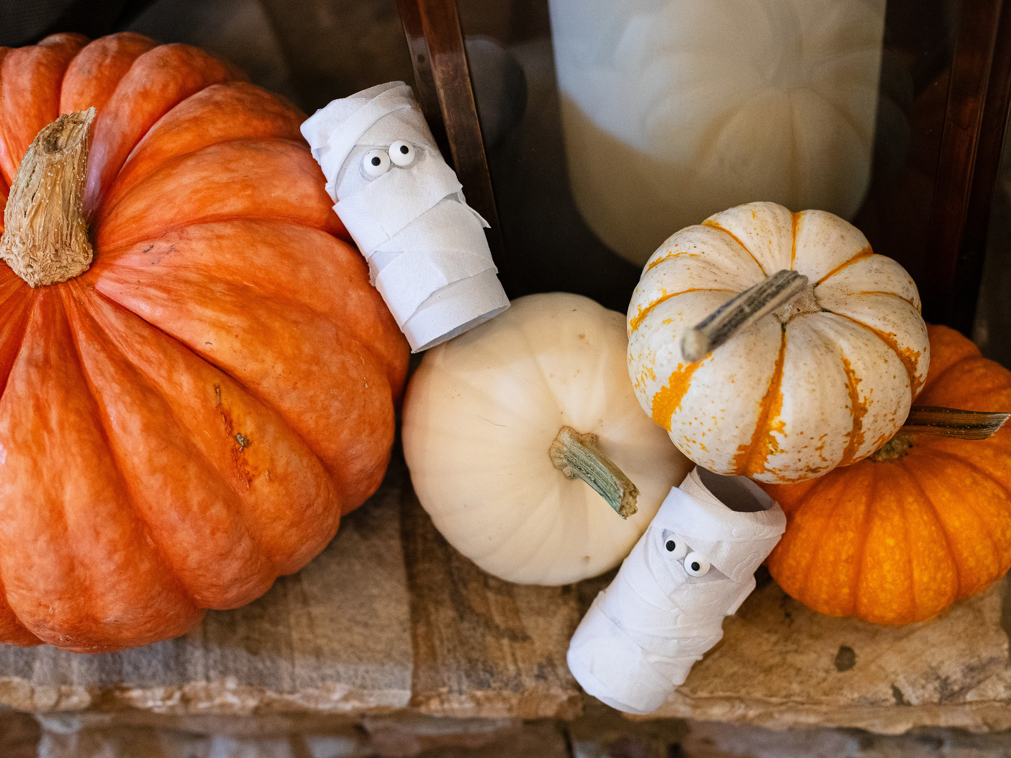 Just tear a few strips of the toilet paper and tape around the roll then add some eyes and that’s it. Place the mummies around your home for a little holiday fun without a lot of effort.
