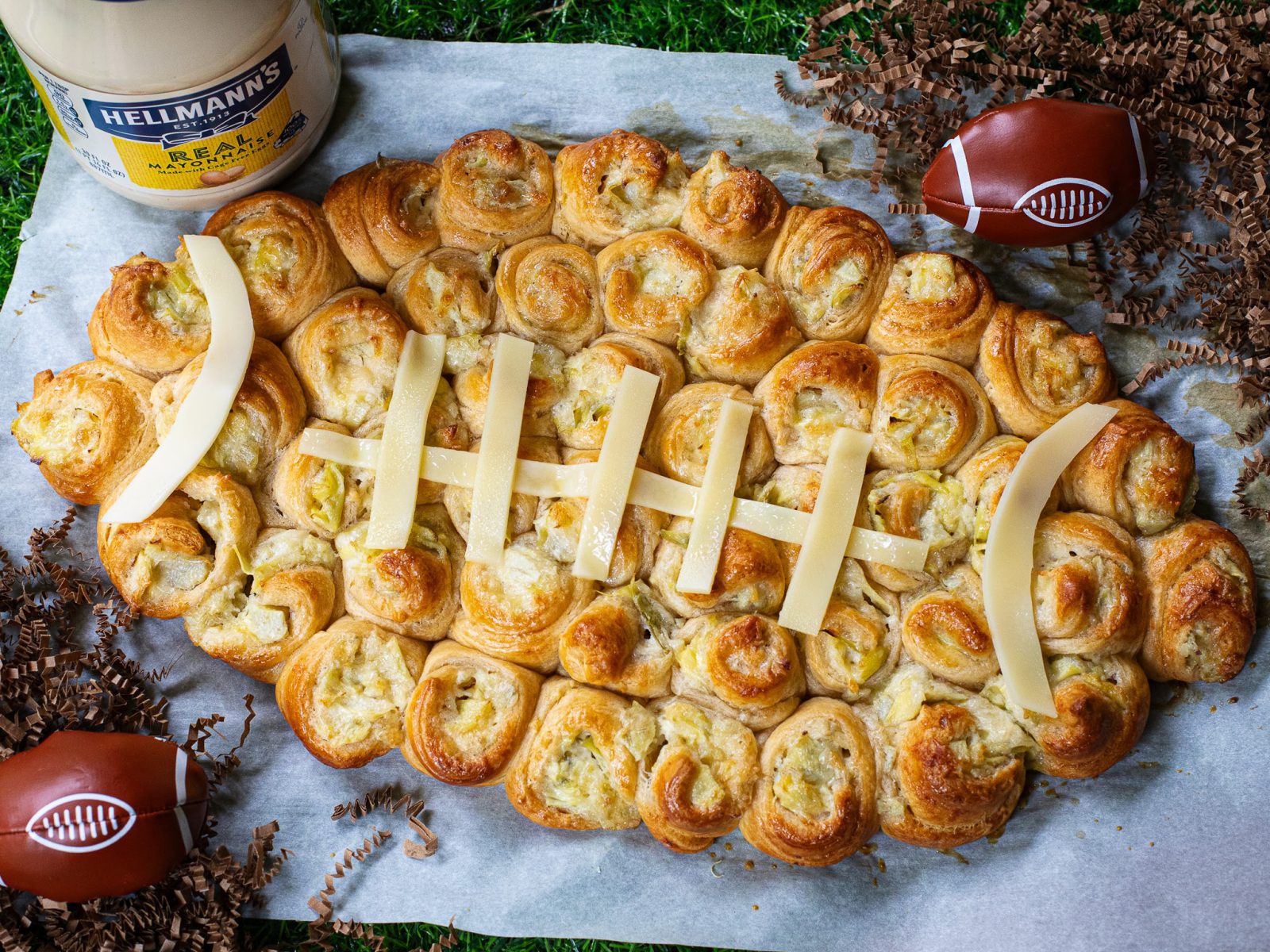 When it comes to finger foods, I think themed dishes are the way to go. When folks see my football pull-apart, they can’t help but dig in. Then when they find out it’s stuffed with delicious Hellmann’s Hot Artichoke Dip, it’s like a match made in heaven. The warm, hearty dip is the perfect filling for the flaky dough, and the whole thing is just so irresistibly good.