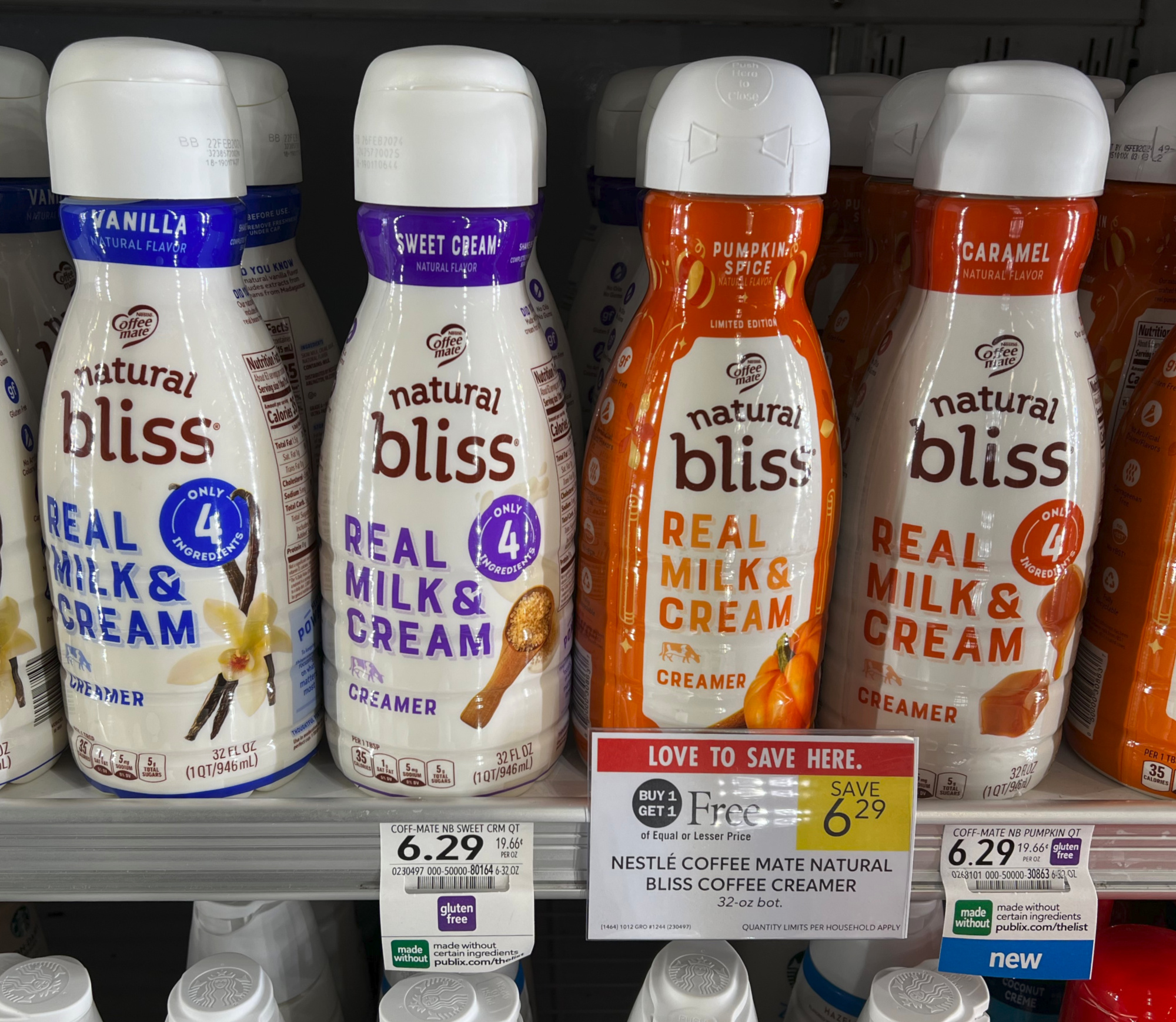 Head over to Publix for a deal on Nestle Coffee-Mate Natural Bliss Coffee Creamer. Combine the BOGO sale and cash back offer to pick up the seasonal flavors for as little as $2.15 the next time you shop!