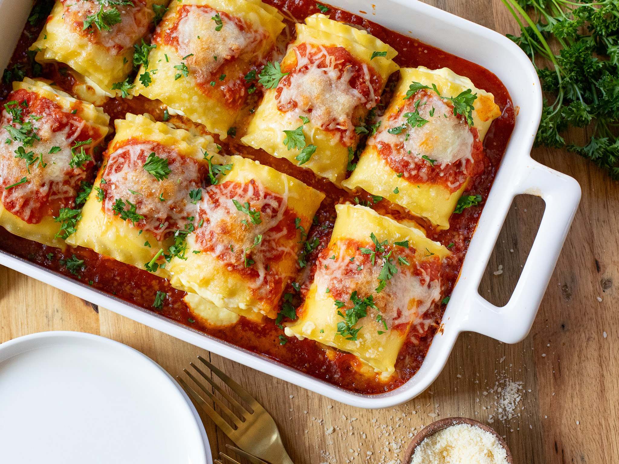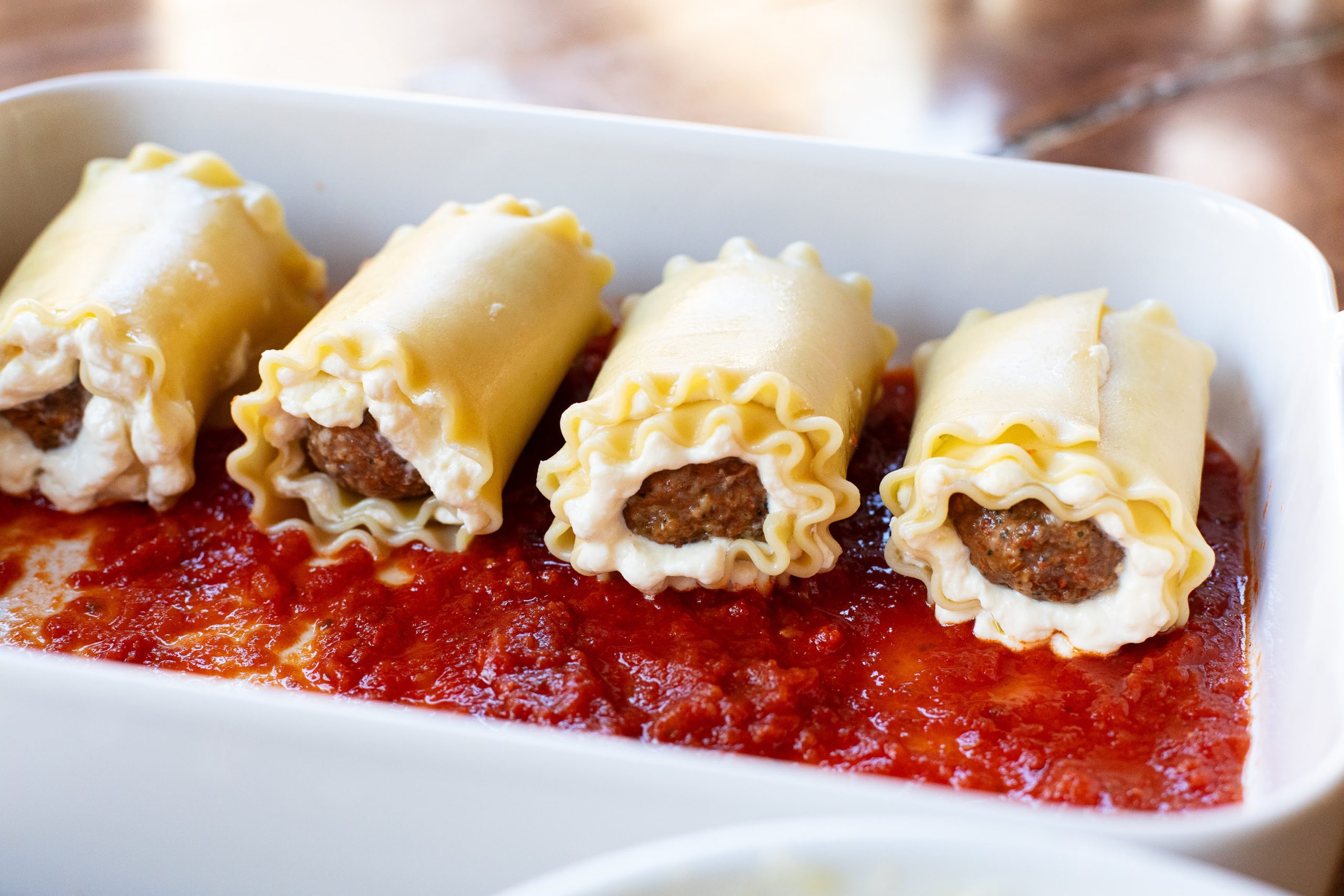 - Starting at the end with the meatballs, roll tightly and place the roll into the prepared casserole dish, seam side down. Repeat with the remaining lasagna noodles.