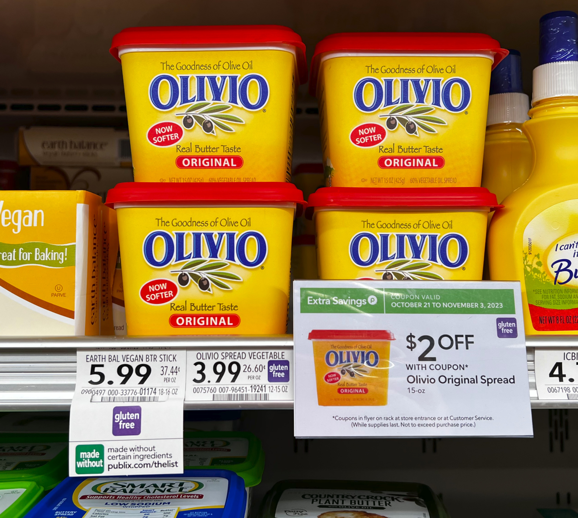 Grab your coupons and pick up a nice deal on Olivio Spread. After coupon and sale, you can pick up a tub for only $1.99 the next time you shop at Publix.