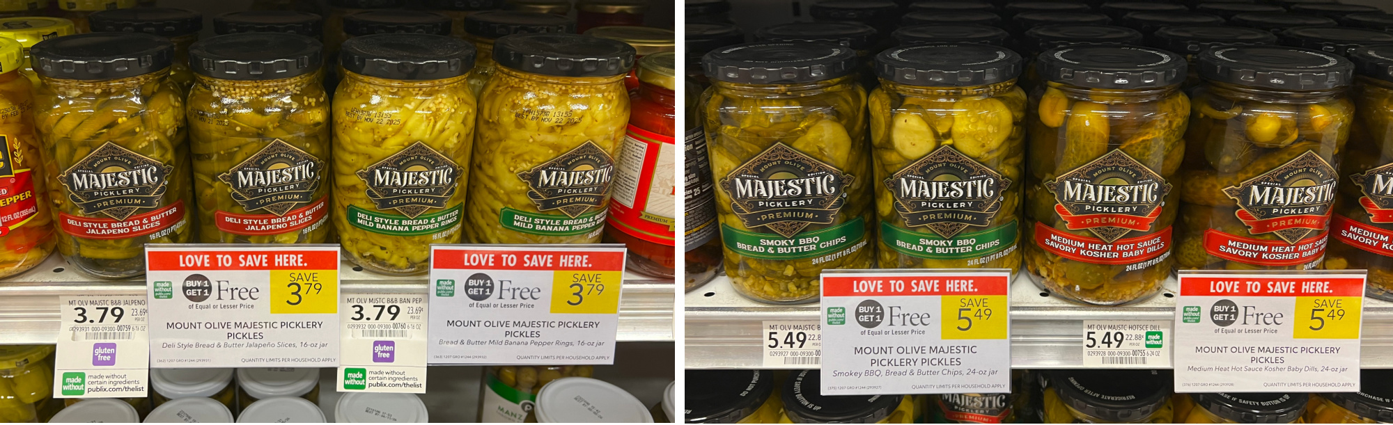Head over to Publix for a deal on pickles. Combine the BOGO and digital coupon to get a jar of Mount Olive Majestic Picklery Jalapeno Slices or Banana Pepper Rings for as little as 90¢! Or grab a jar of pickles for as low as $1.75!