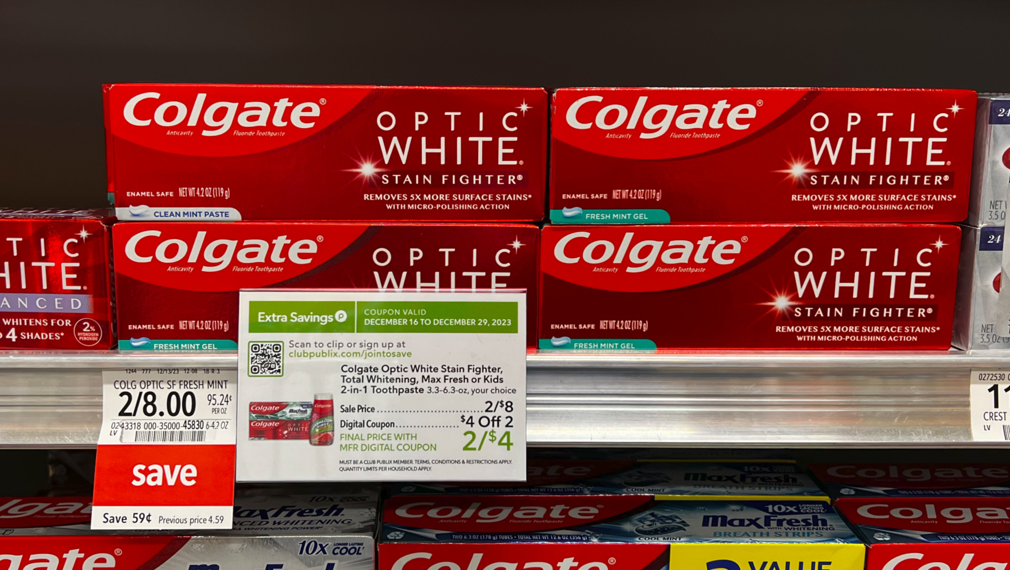 –$4/2 Colgate Optic White Stain Fighter, Total Whitening, Max Fresh, or Kids 2-in-1 Toothpaste, 3.3 to 6.3 oz (Publix Digital Coupon)