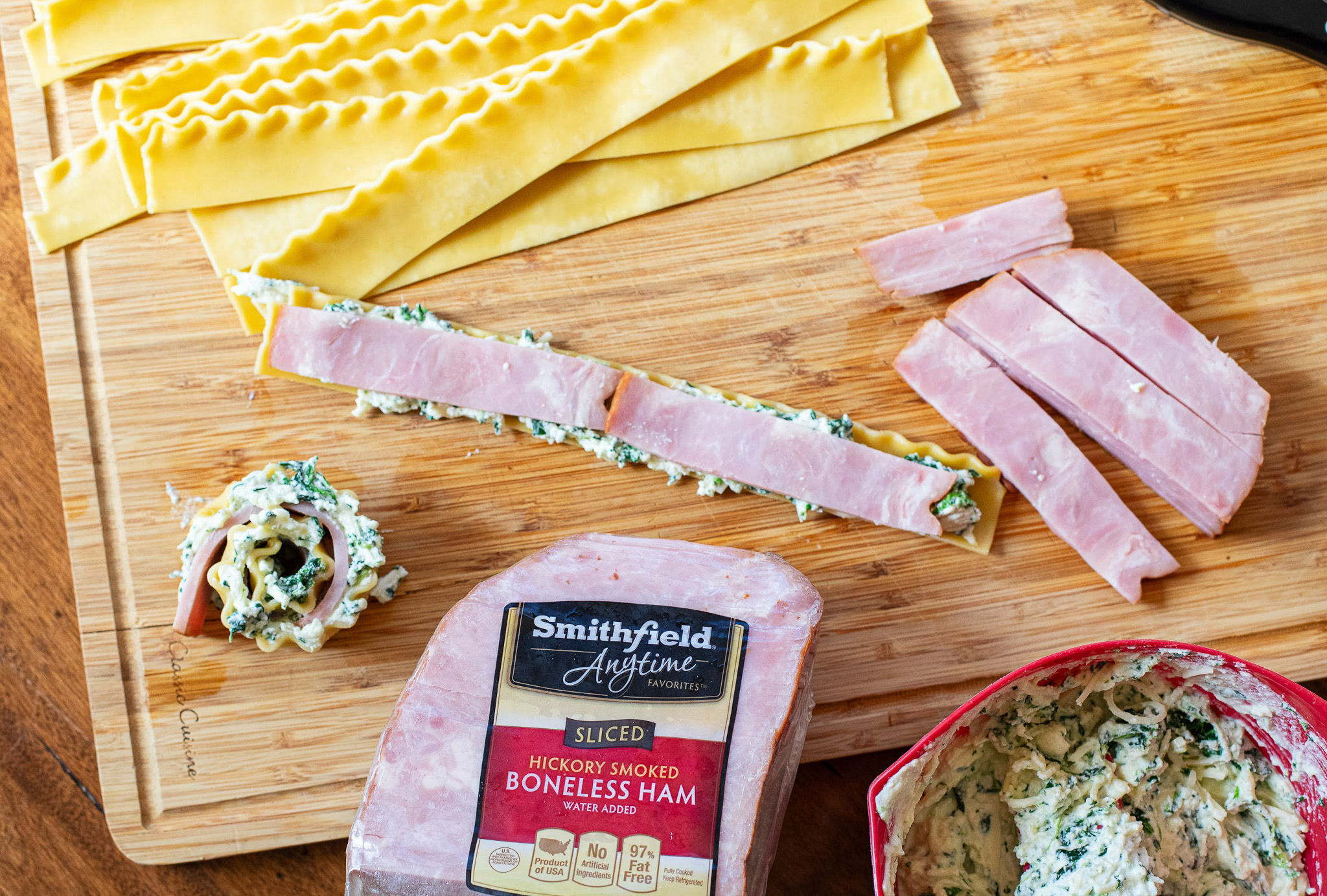 My spin on a creamy lasagna, you just layer ricotta, mozzarella and spinach with Smithfield sliced ham on a lasagna noodle and roll it all up. The rolls are then cooked in a creamy béchamel sauce for a dish that tastes incredible. Grab your deal and pick up a few ingredients and you can have this tasty dish on your menu this week!