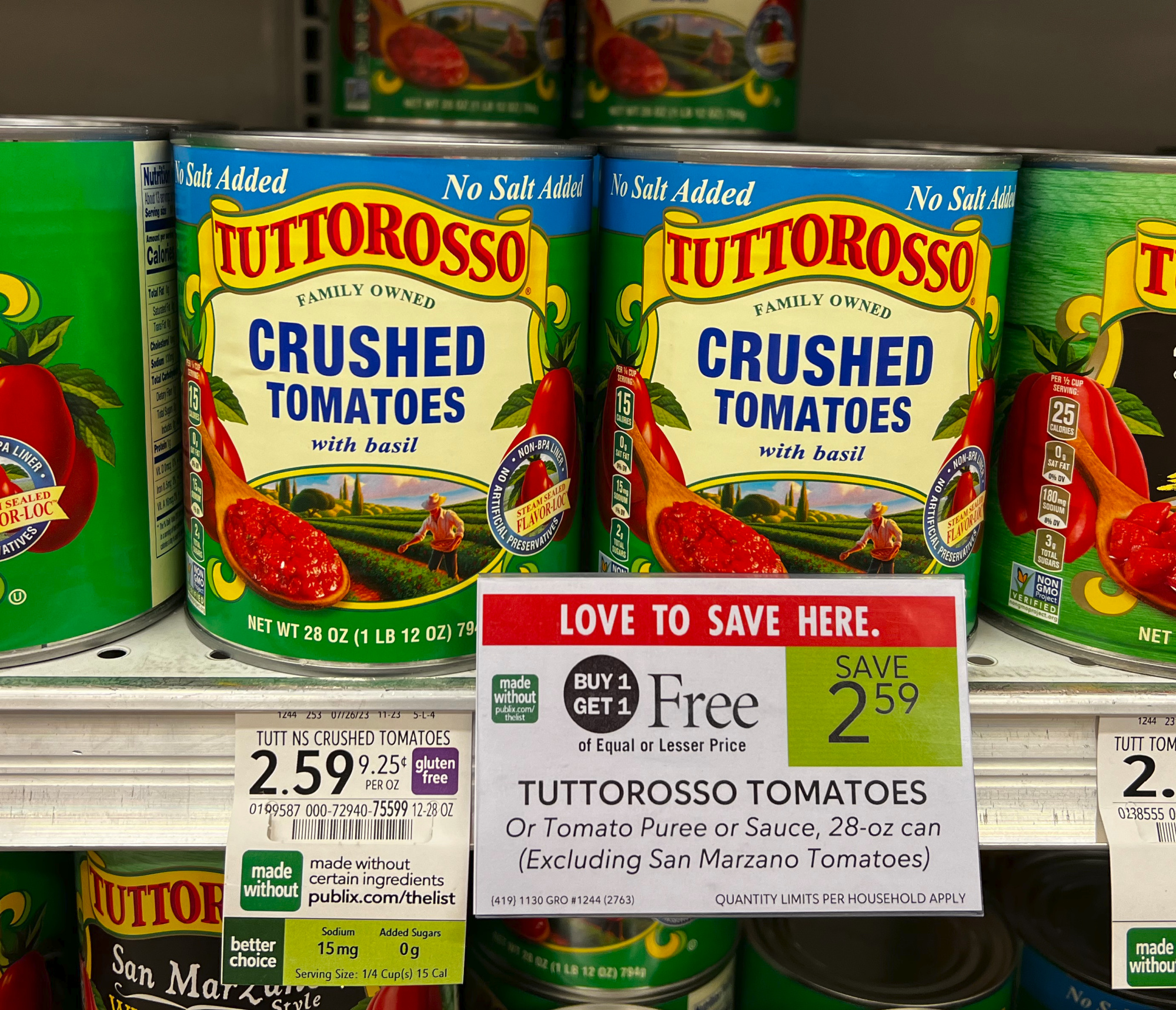 Head to Publix and stock up on Tuttorosso Tomatoes. After coupon and sale, you can pick up cans for as little as $1.05 each. Remember these are the big 28 oz cans and will definitely come in handy for soups, stews, chili, etc!