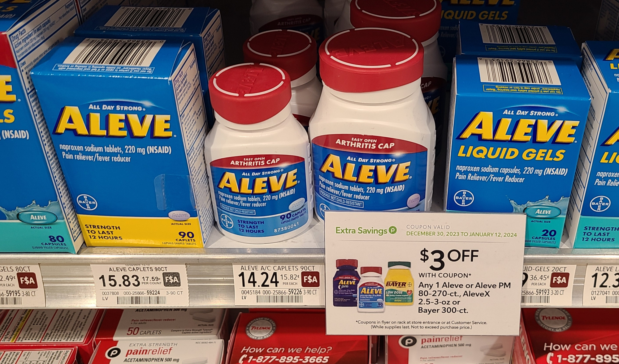-$3/1 Aleve, or Aleve PM, 80 to 270 ct, or AleveX, 2.5 to 3 oz, or Bayer, 300 ct, Extra Savings Flyer In-Ad Publix Coupon (valid 12/30 to 1/12)