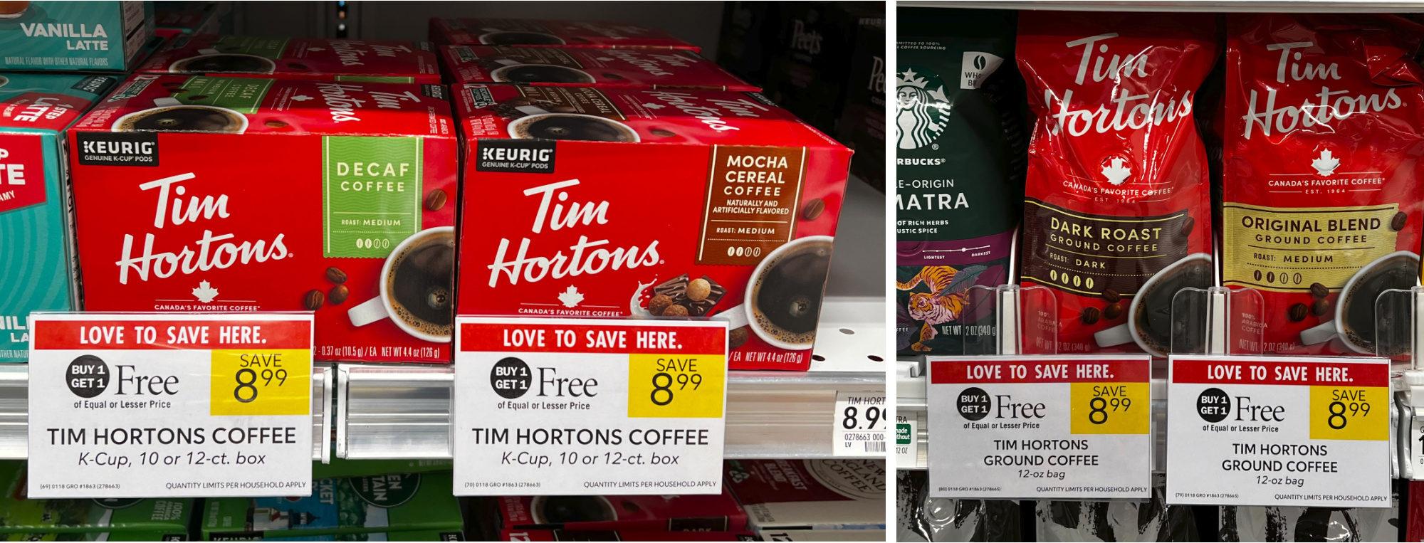 Combine the BOGO sale and coupon to pay $3.50 for the bags/boxes of Tim Hortons Coffee the next time you shop. Great time to restock your coffee supplies!