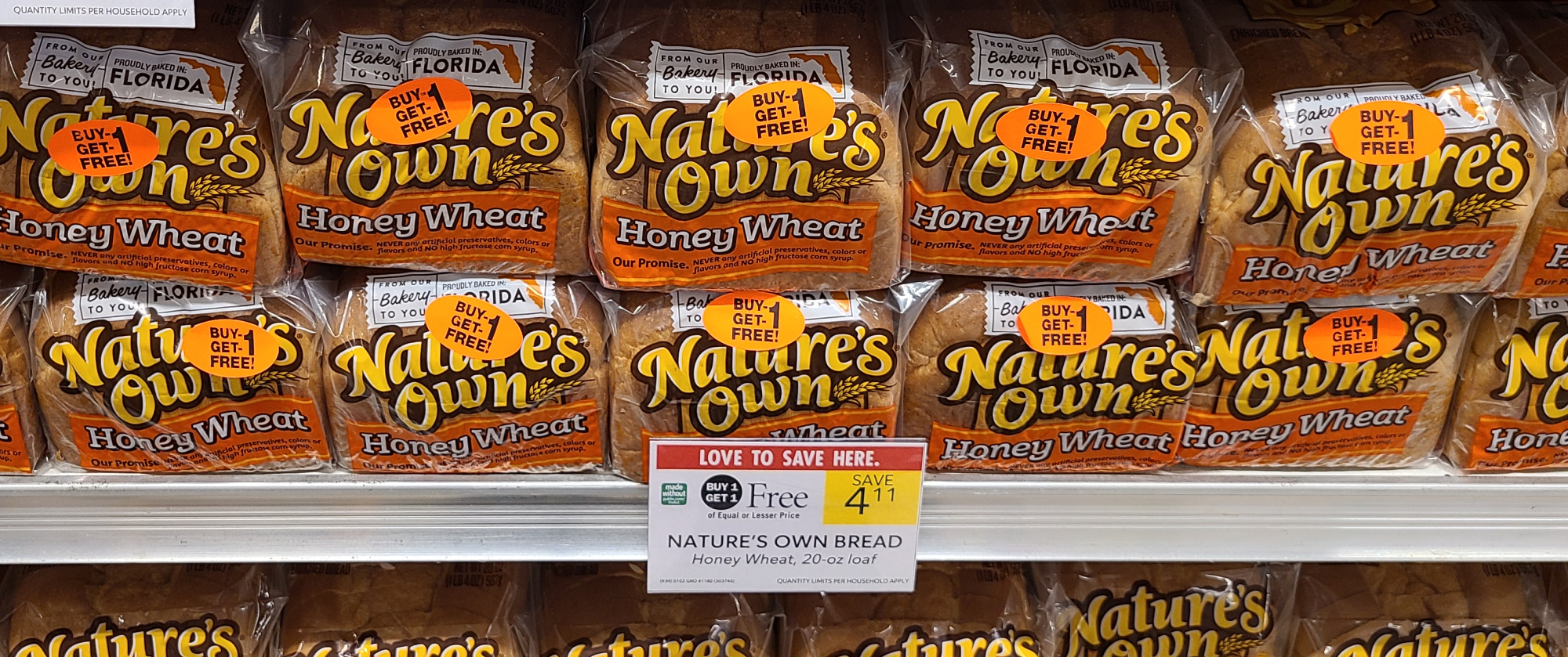 Nature’s Own Honey Wheat Bread, or 100% Whole Wheat, or 100% Whole Grain, 20 oz, BOGO $4.11