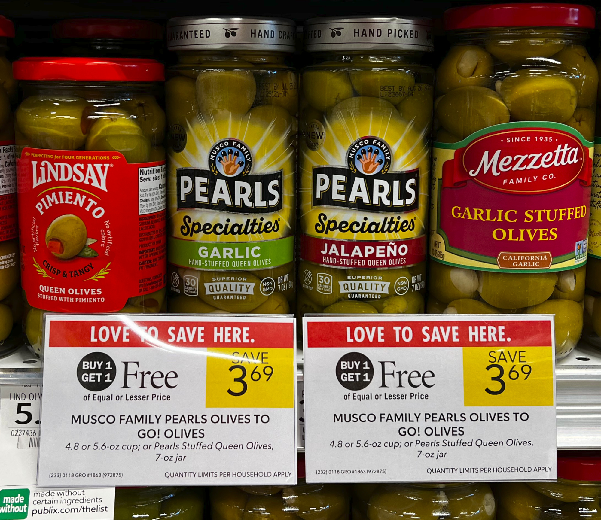 This week the jars of Pearls Specialties Stuffed Queen Olives are BOGO at Publix. Add in the cash back offer to pay just $1.35 per jar.
