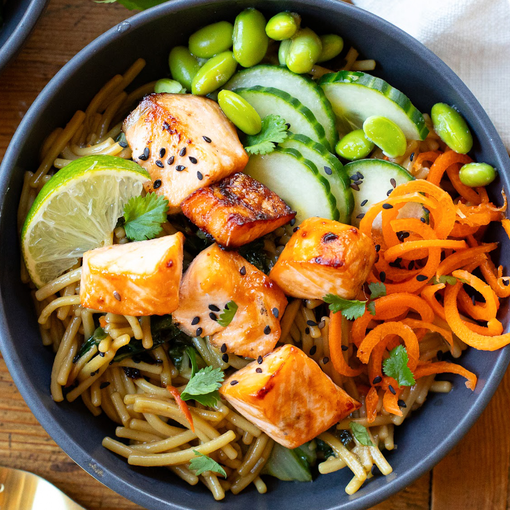 - To serve, divide the prepared Knorr Teriyaki Noodles into 4 bowls and top each with edamame, sliced cucumber, carrots and the prepared salmon bites. Drizzle with the prepared teriyaki sauce and serve with chopped cilantro and lime wedges.