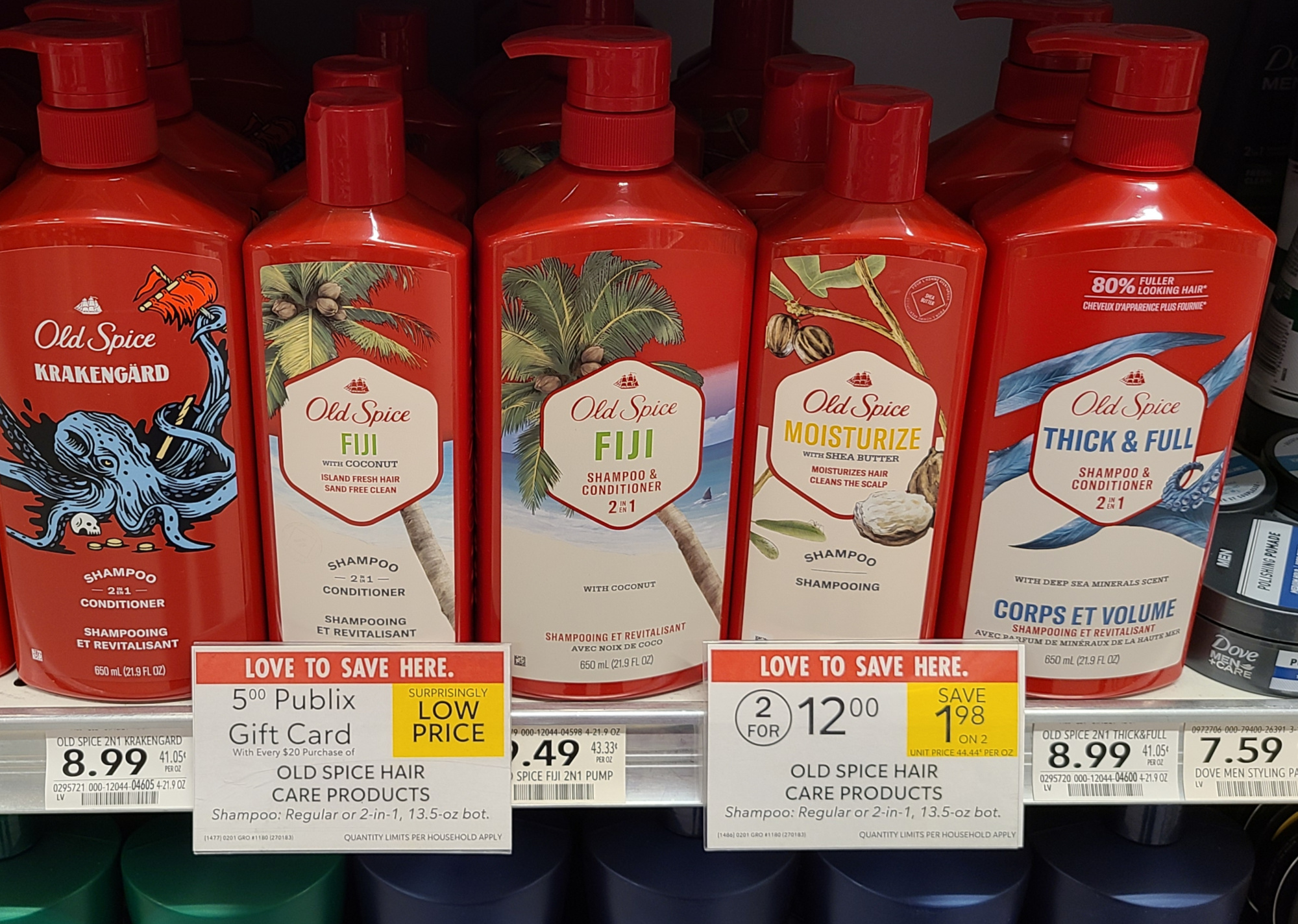 Score a super discount on Old Spice Hair Care at Publix. Combine the sale, gift card offer, and coupon and get the bottles as low as $3.50 each. That’s a better price than the regular price of $6.99!