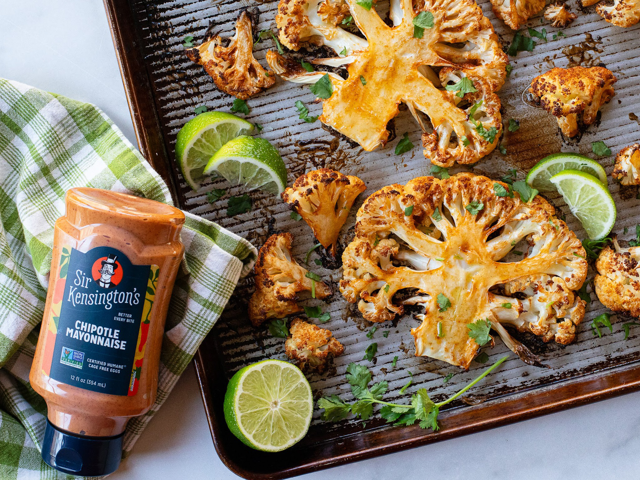 Take advantage of the savings and grab a bottle of Sir Kensington’s Chipotle Mayonnaise, a head of cauliflower and a lime and you are in business! All it takes is about 5 minutes of prep and after 40 – 45 minutes in the oven, you end up with an amazing side that even your pickiest eater will enjoy!