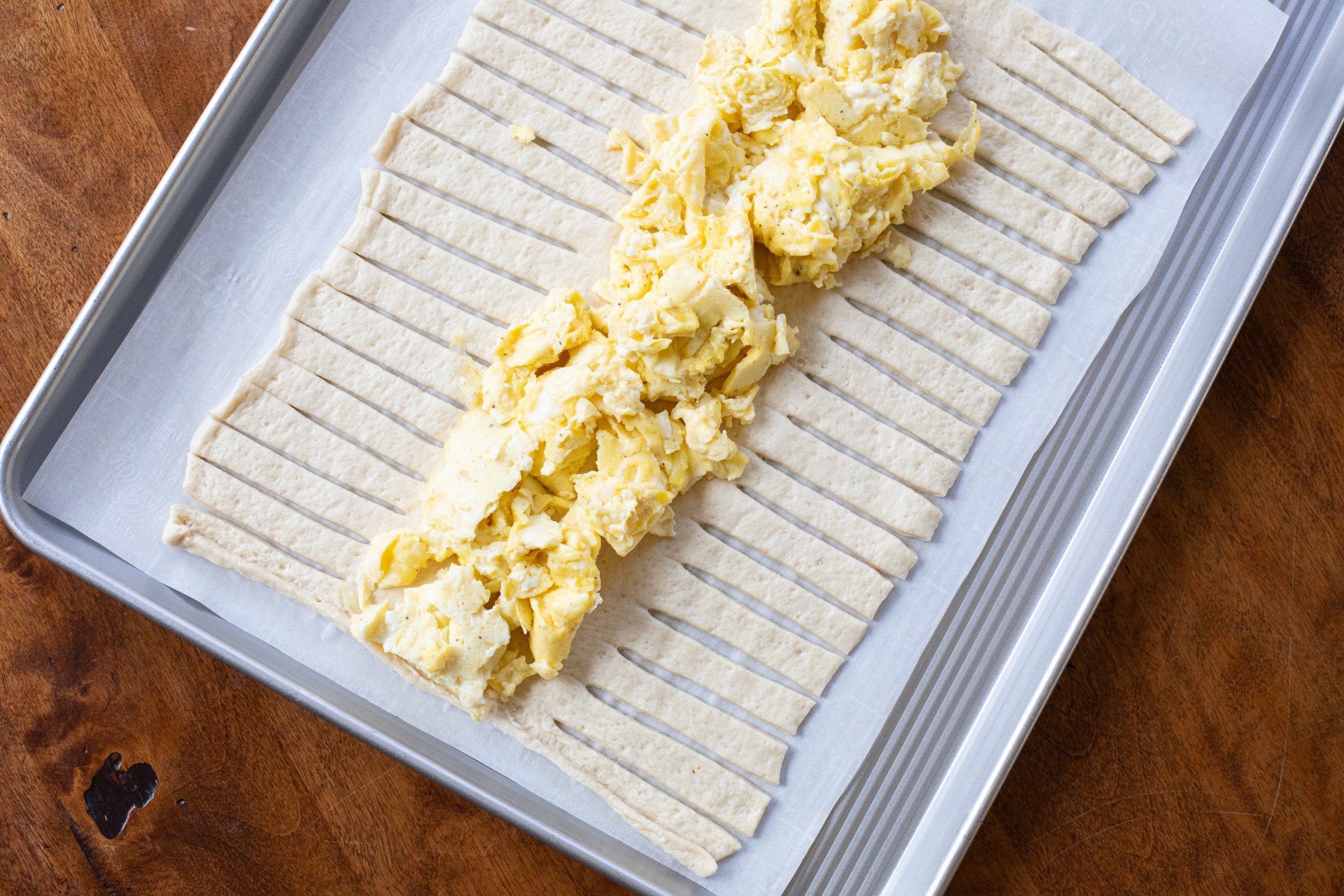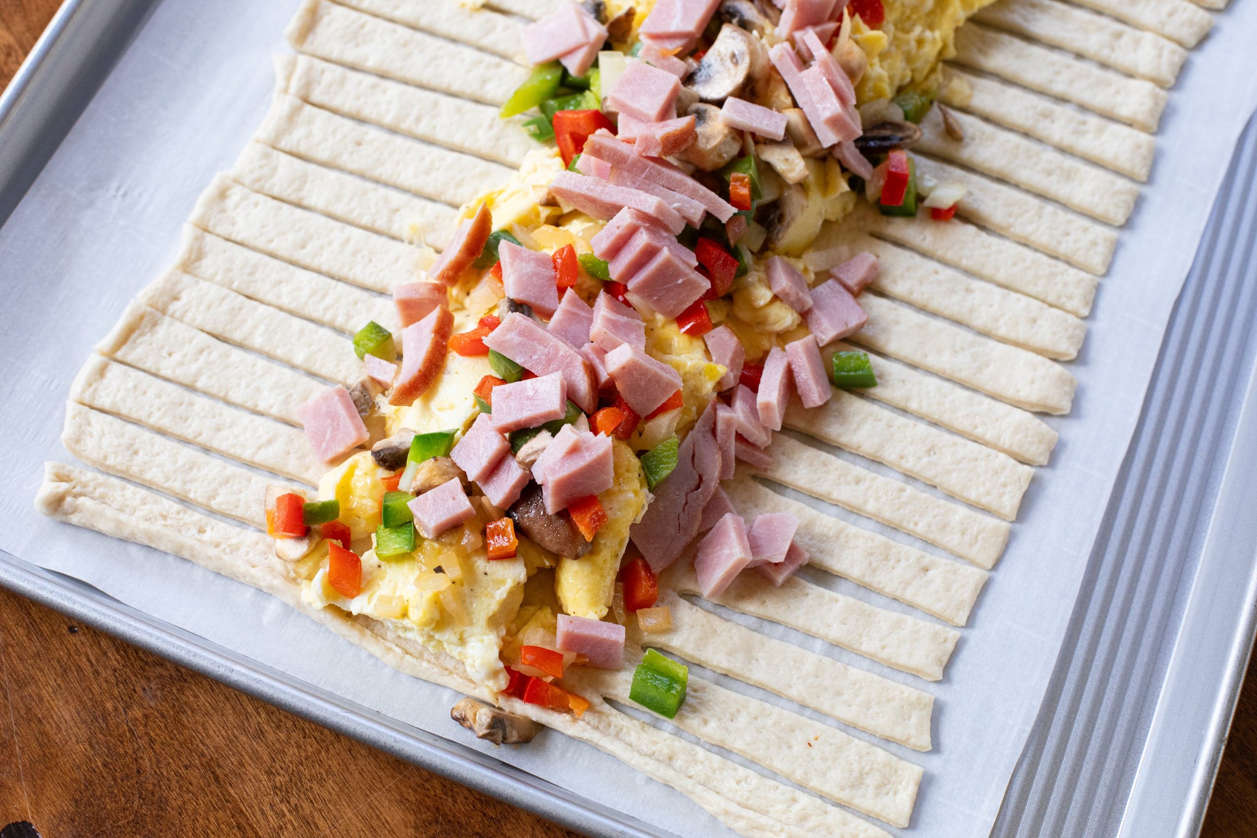 Start by rolling out your pizza crust (or crescent sheet) and then use a pizza wheel or knife to cut slits in the sides of the dough, leaving the middle intact.