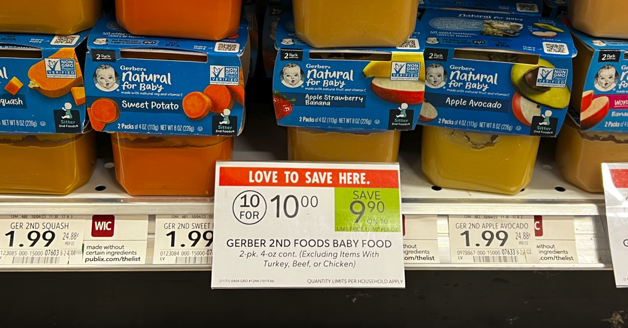 Head over to Publix right now and pick up Gerber Baby Food on the cheap. Unlock your cash back offer before you shop and get the two packs for as little as 63¢ each… that’s around 32¢ per container.