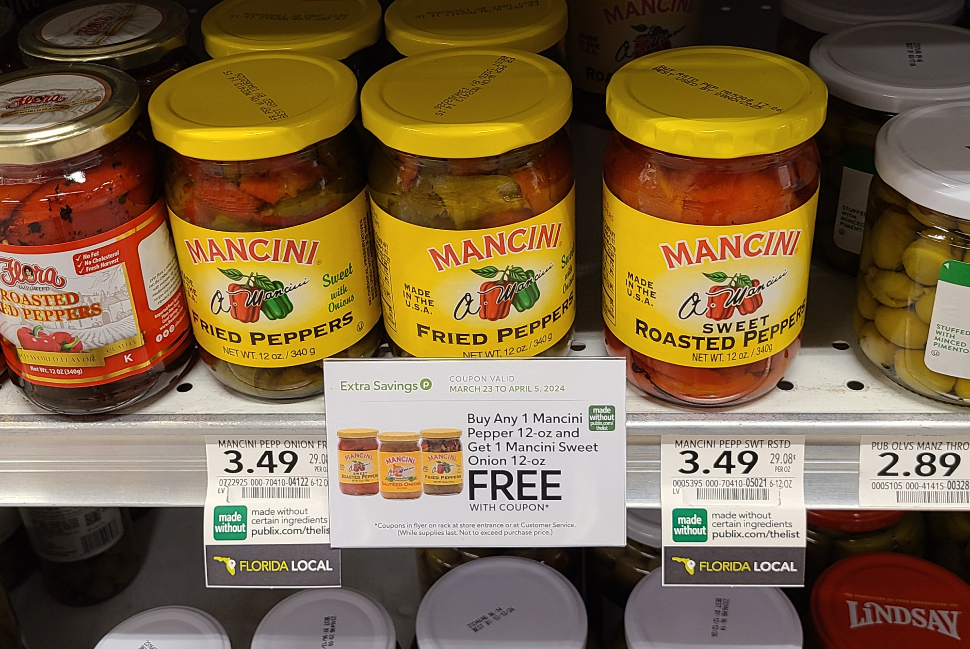 -FREE Mancini Sweet Onion, 12 oz, wyb (1) Mancini Pepper, 12 oz, Extra Savings Flyer In-Ad Publix Coupon (valid 3/23 to 4/5)