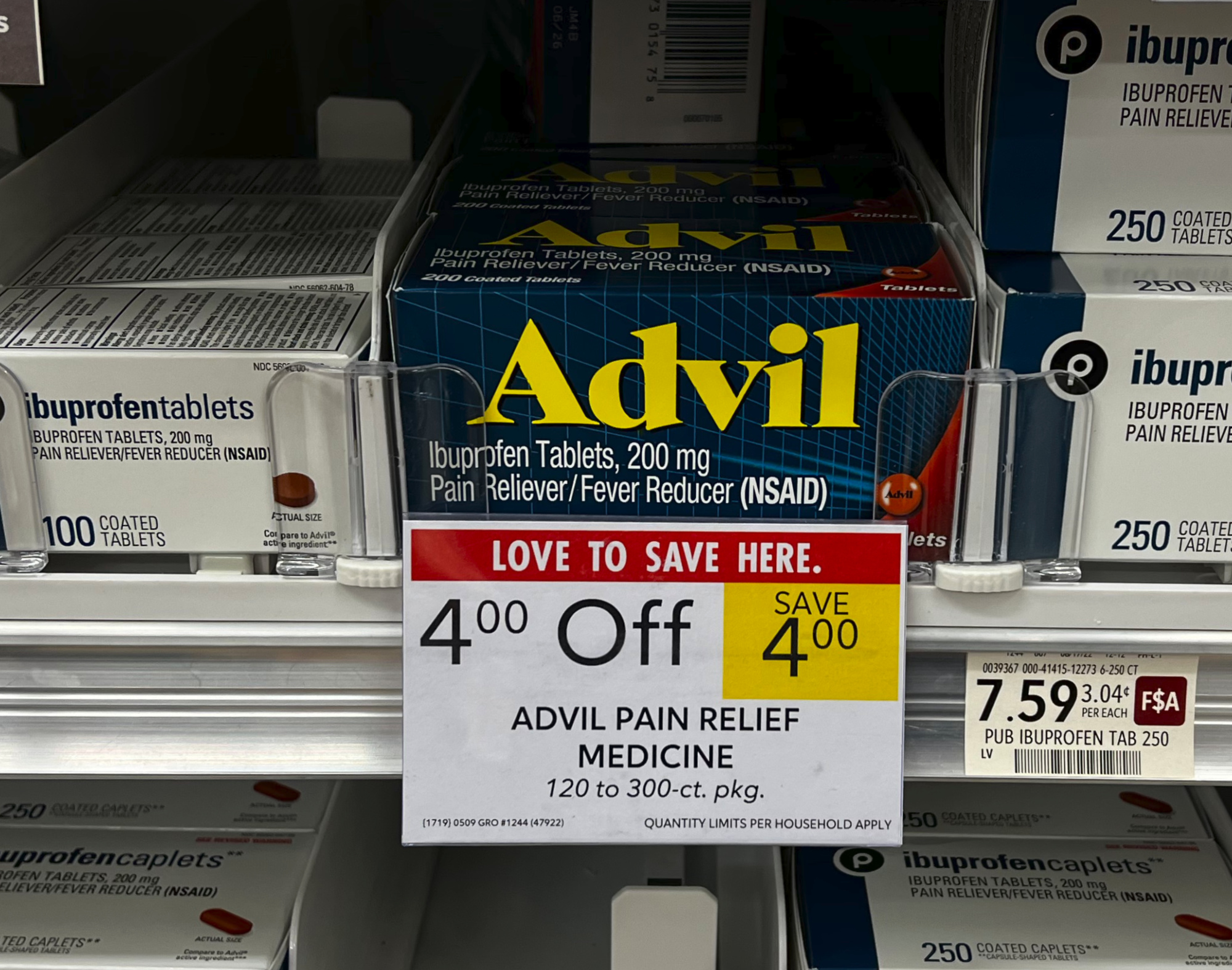 Gather your coupons and get a HUGE discount on Advil pain meds. After sale and coupons, you can pick up the big bottles for as little as $12.89… that’s a savings of $9 per bottle!