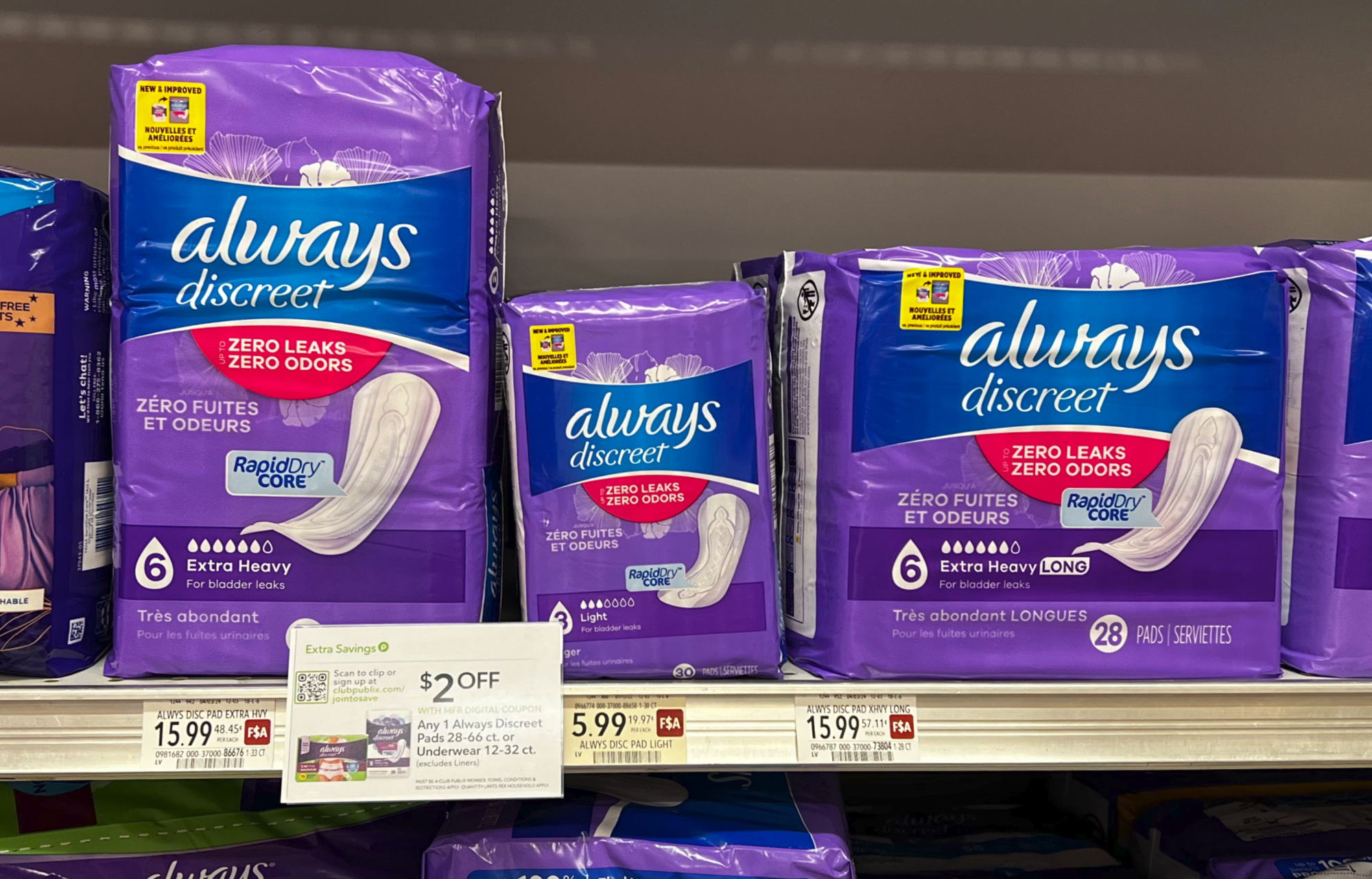 –$2/1 Always Discreet Incontinence Products (Excludes, 24 ct, 26 ct, or 44 ct, and Always Discreet Liners, and other Always Products and trial/travel size) (Publix Digital Coupon)