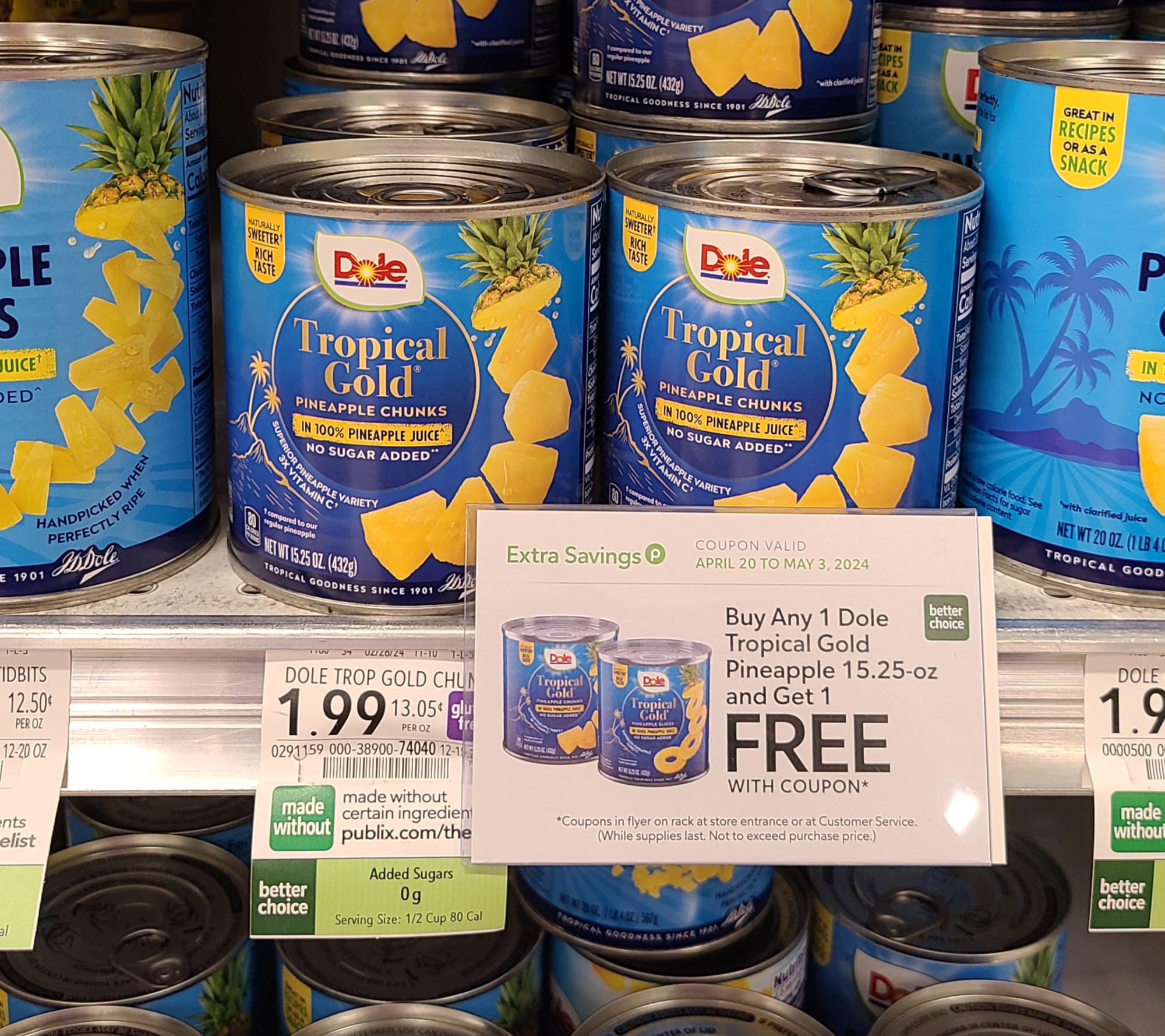 -B1G1 Dole Tropical Gold Pineapple, 15.25 oz, Extra Savings Flyer In-Ad Publix Coupon (valid 4/20 to 5/3)